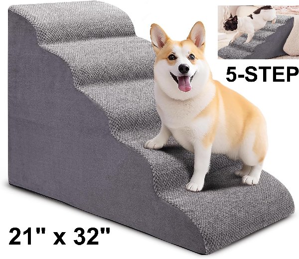 Non-Slip 5-Step Pet Stairs, for Bed and Couchfoam Dog Ramp - 21" x 32" - grey