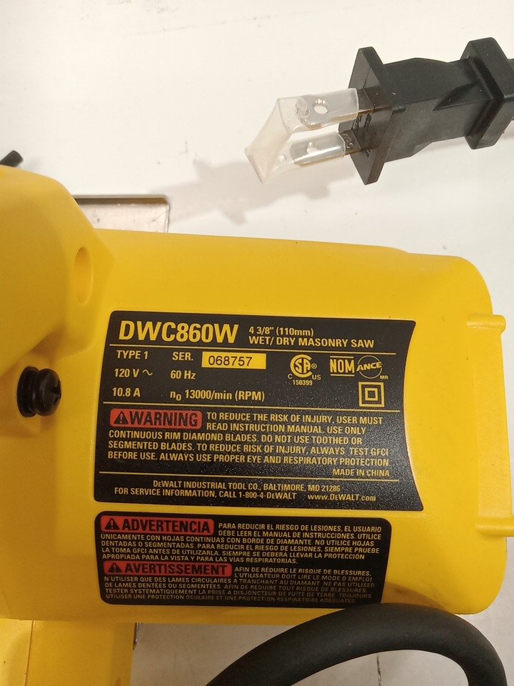 DEWALT WET/DRY MASONRY SAW - 4-3/8" BLADE - 10.8AMP/1300W/13000RPM - YELLOW/BLACK (MODEL: dwc860w)