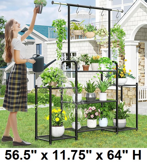 7-TIER SIMPLE TRENDING PLANT STAND WITH MULTIPLE SHELVES & HANGING HOOKS - 64" H - BLACK