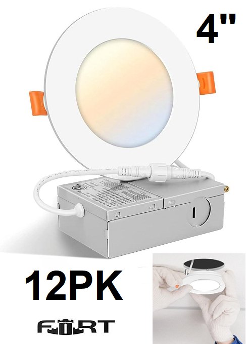 12pk FORT 5CCT LED Recessed Slim Pot ceiling Lights - 4", 780LM, 9W, 2700K/3000K/4000K/5000K/6000K Selectable, Dimmable - white (model: ‎4inch-5cct-000)