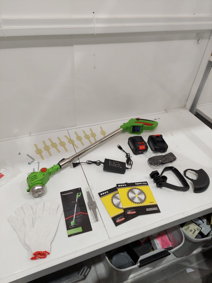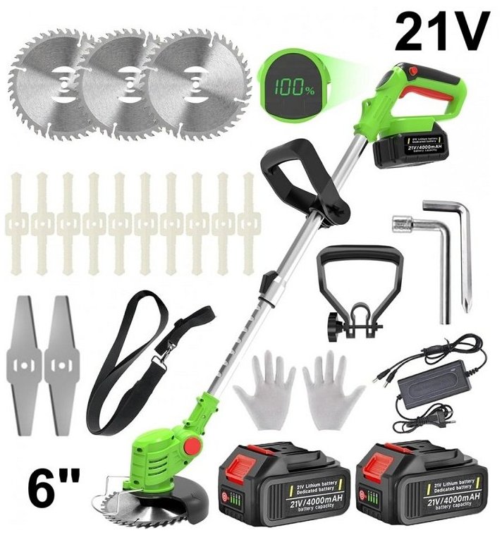 Cordless weed whacker/grass trimmer with ADJUSTABLE length, 2 batteries, and 3 blades - 6" blade - 21v - yellow (model: hy-02)