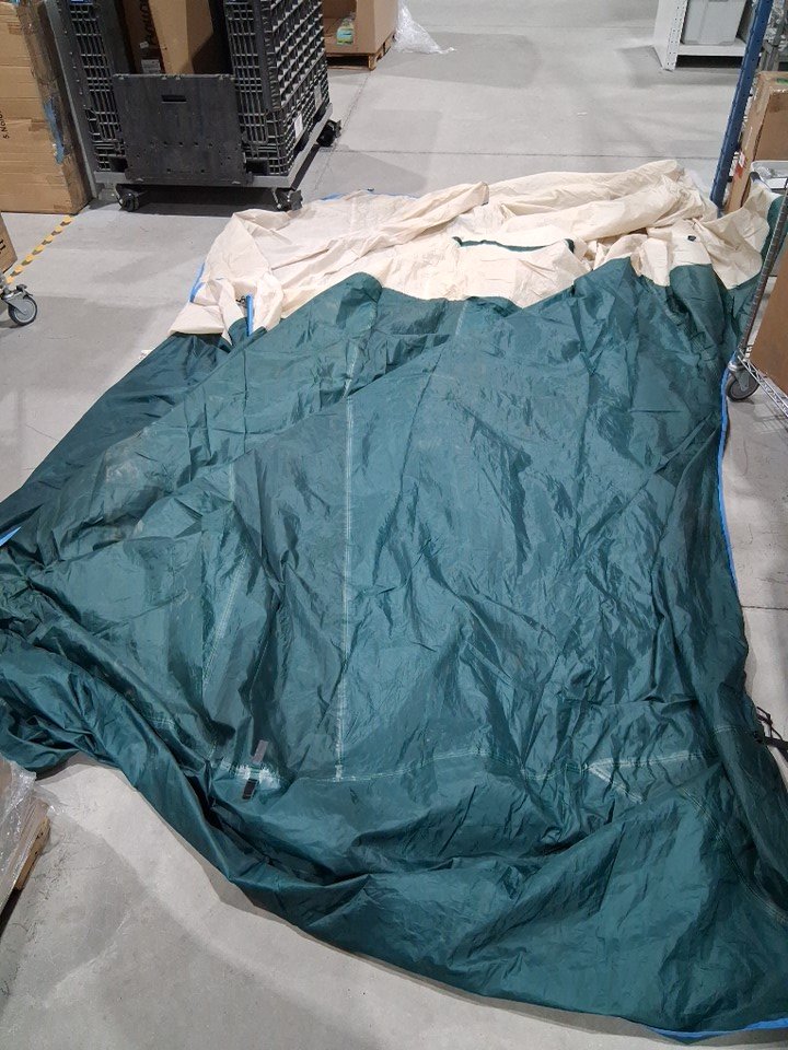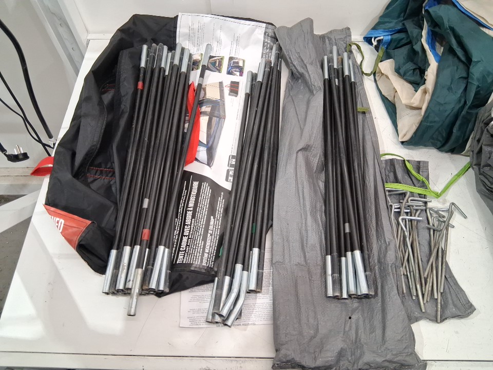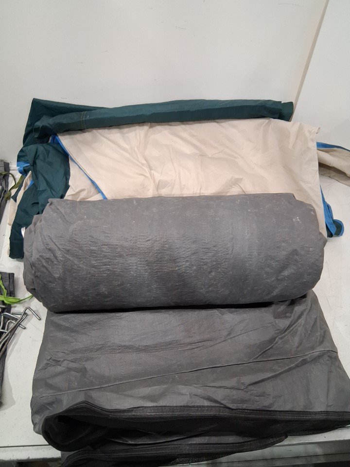 The tent, poles, and pegs have some dirt on them indicating previous use (see photos)