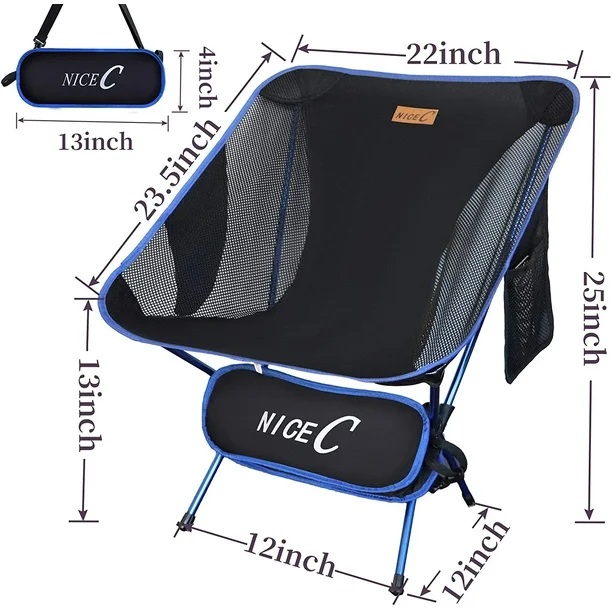 NiceC portable folding camping chair with two side pockets and storage bag - 25" - blue/black