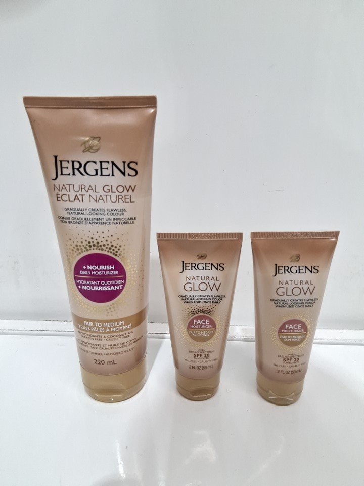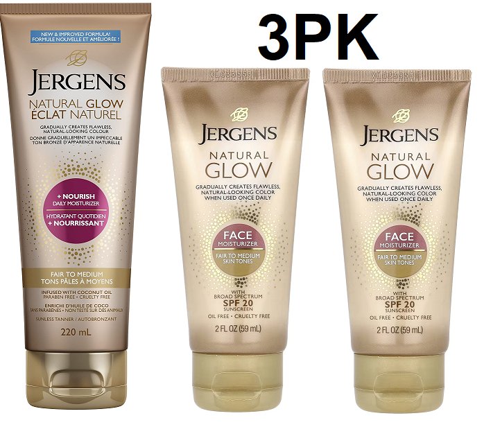 3PK JERGENS NATURAL GLOW MOISTURIZERS - DAILY MOISTURIZER + NOURISH (220ML) & FACE MOISTURIZER WITH SPF 20 (59ML EACH) - FAIR TO MEDIUM TONE