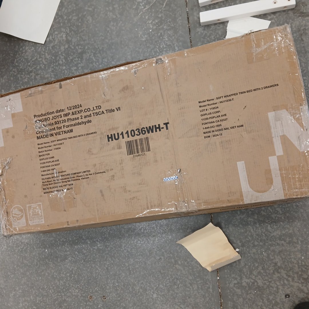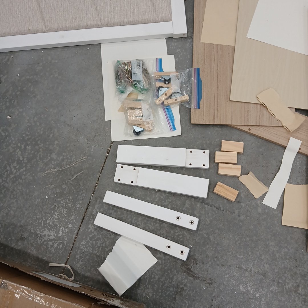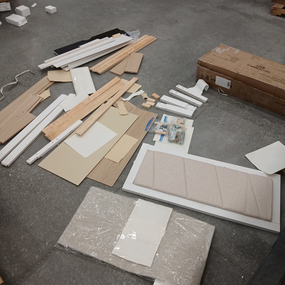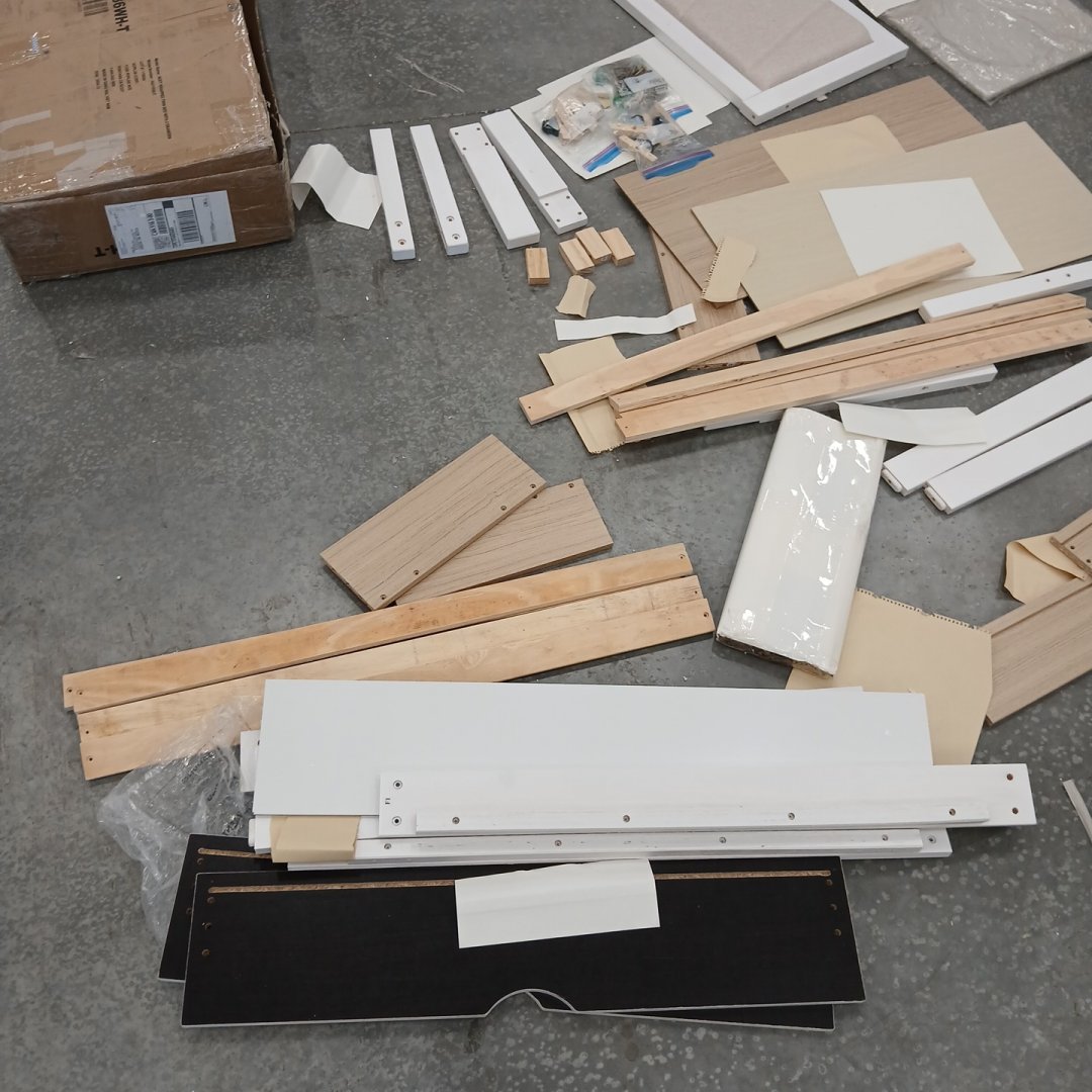 item has some light scuffs due to shipping. May be missing a middle slat, as well as a panel for the interior of a drawer.