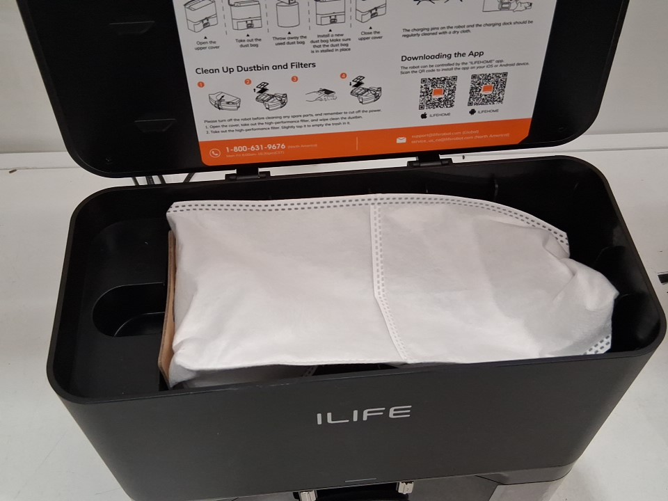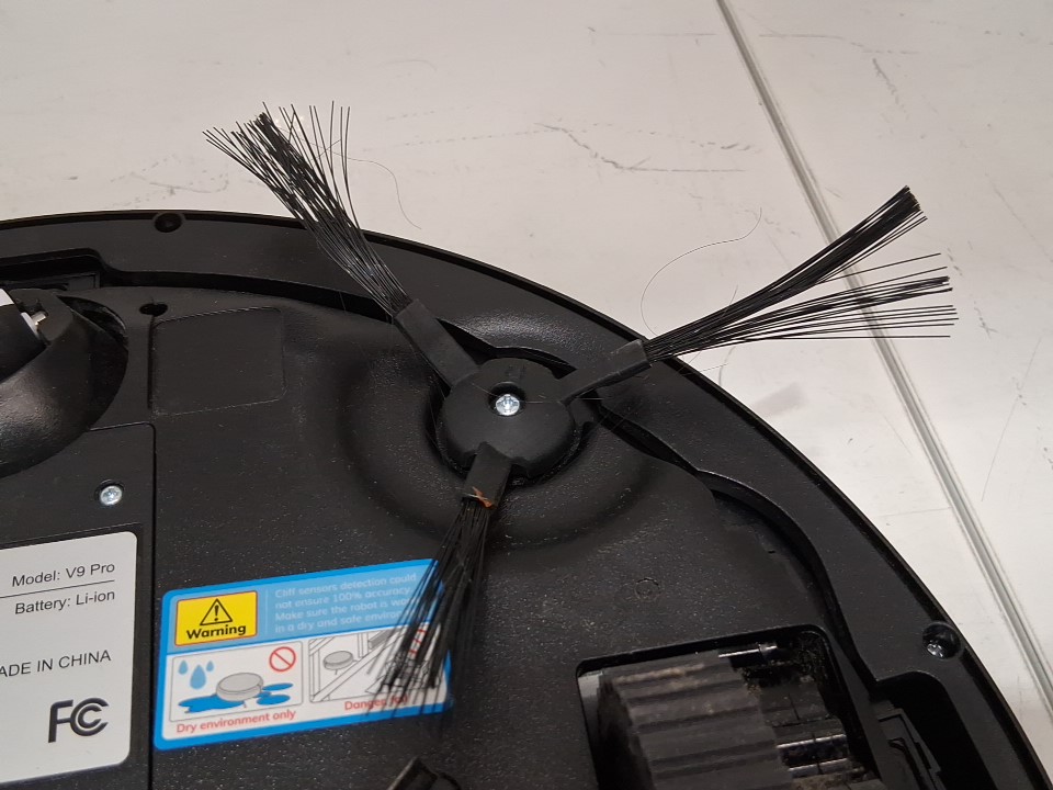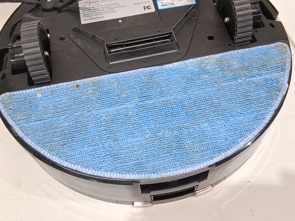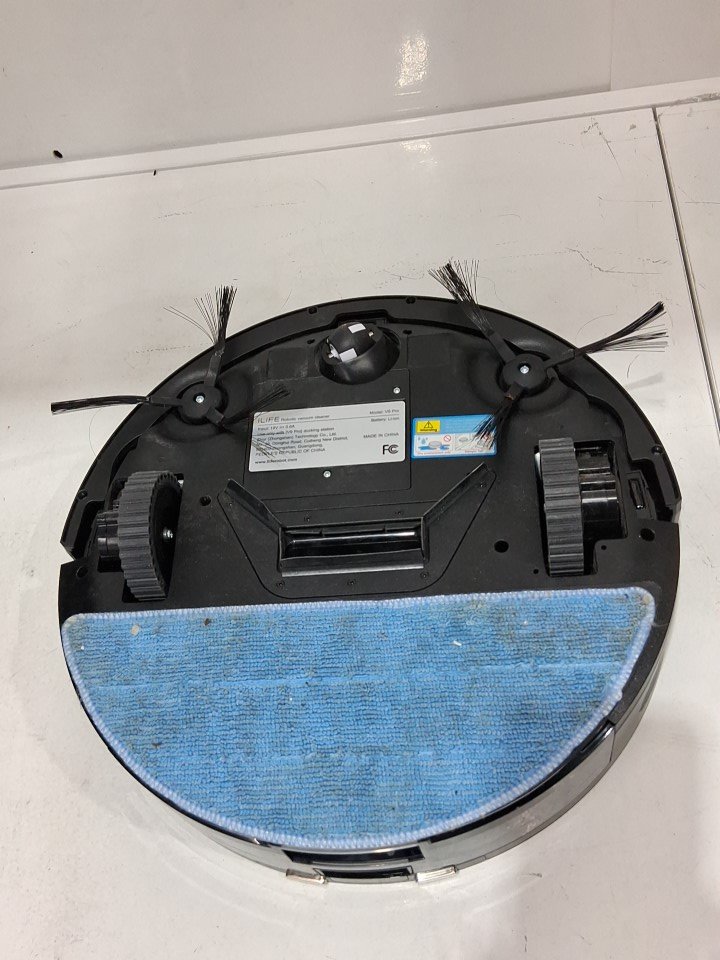 **Tested for power, movement, basic functions (spot clean/return home) using the buttons on the robot.** Item has minor debris in the docking area and dustbin/filter area, light wear on the mop pad and side brushes from previous gentle use, see photos.