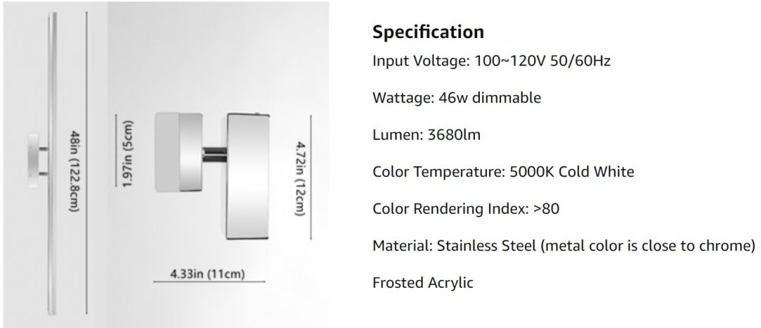 MIRREA 48" WALL MOUNTED Modern LED Vanity Light Fixture - 3680lm, 5000K, 46W DIMMABLE - STAINLESS STEEL SILVER (MODEL: J1200-46W)