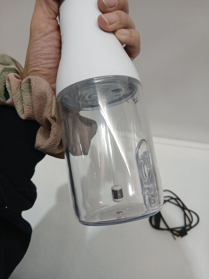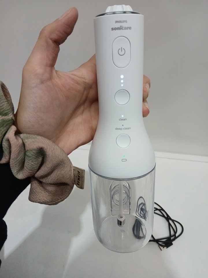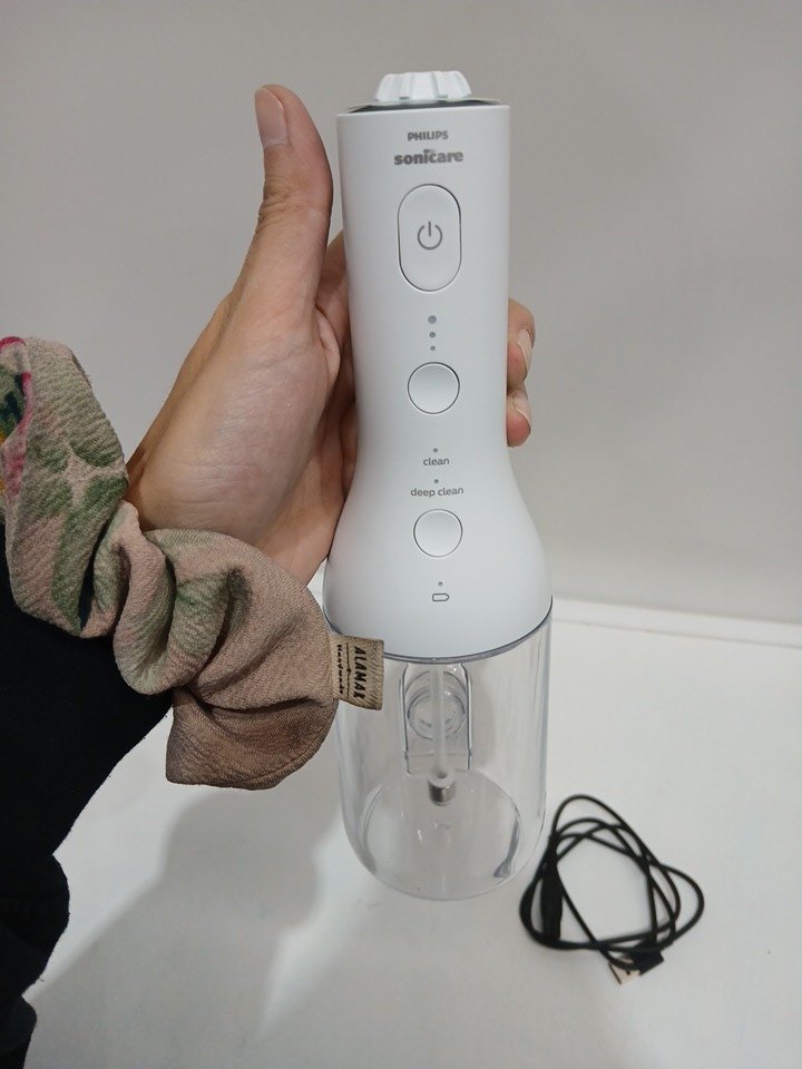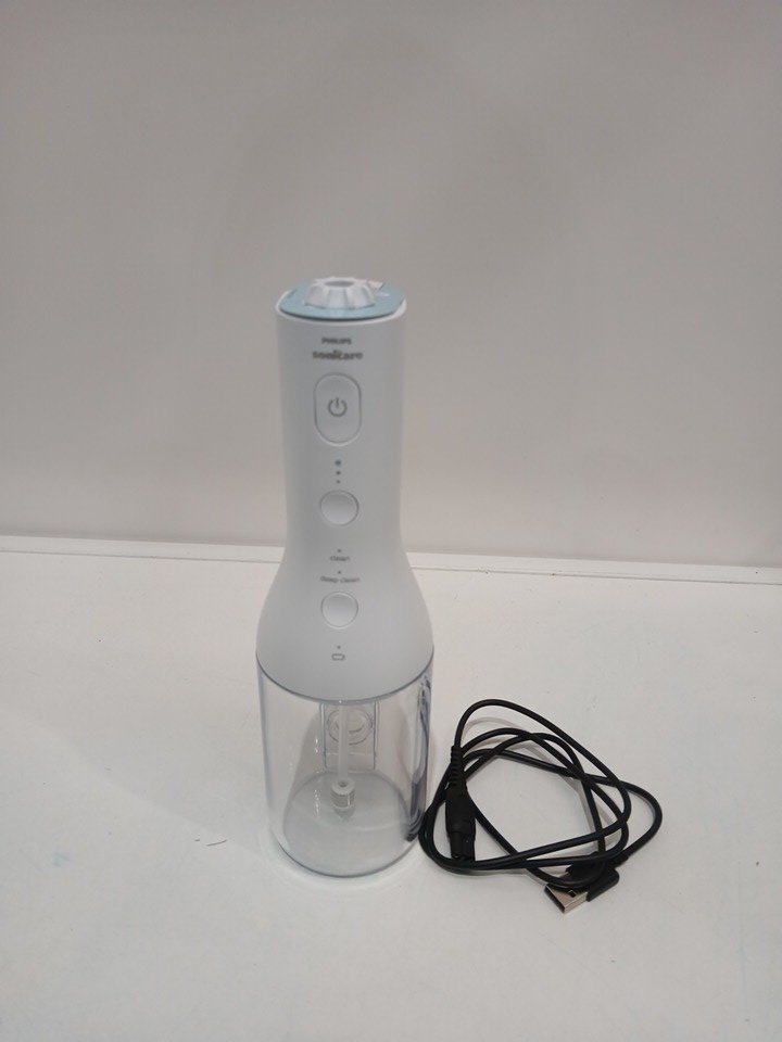 The flosser has water marks, the nozzles are missing, it was tested for power, and the cord was not included, so it was replaced.