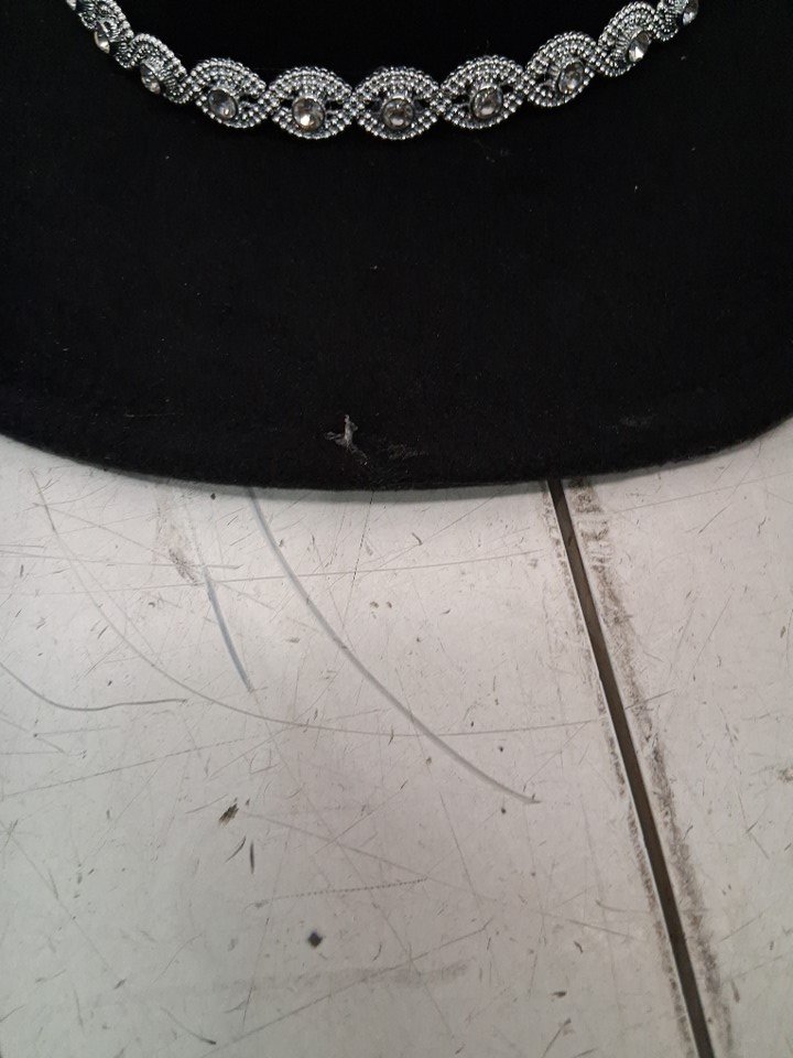 Part of the trim has fallen off/ disconnected and there's a bit of glue residue on the brim that may or may not come off.