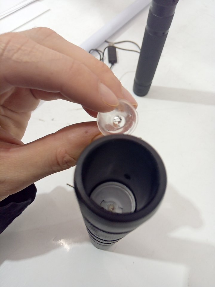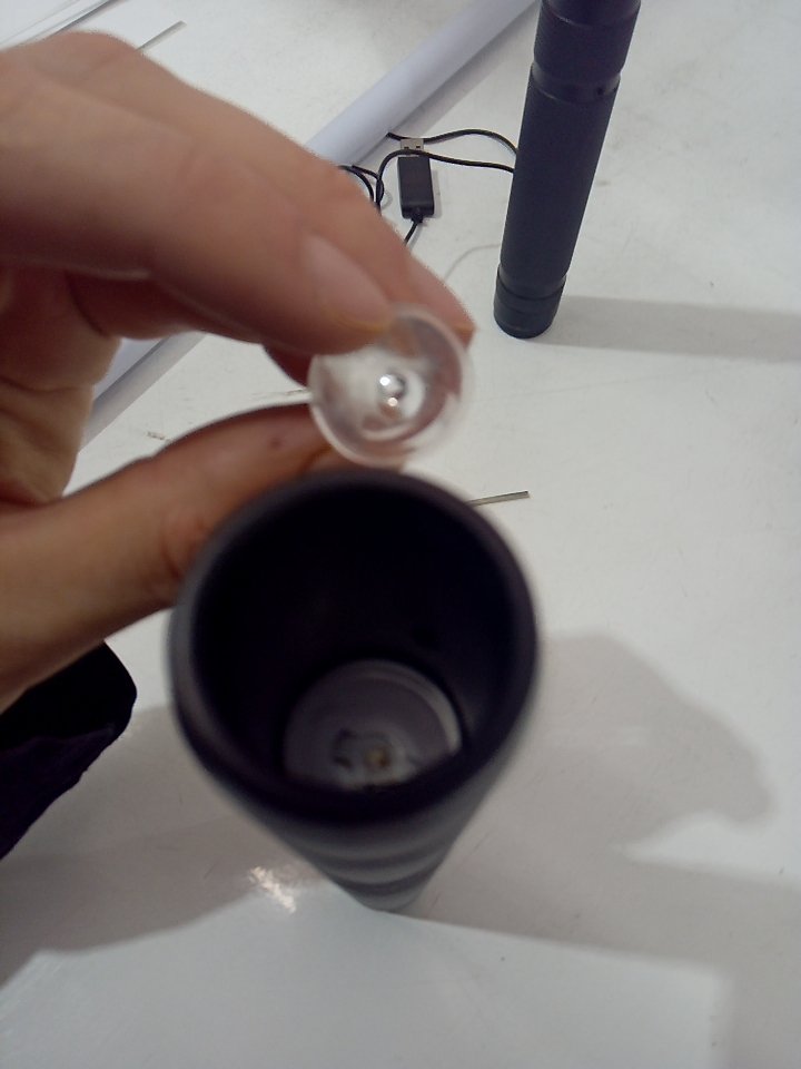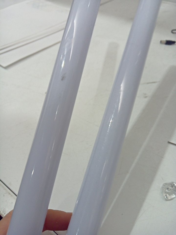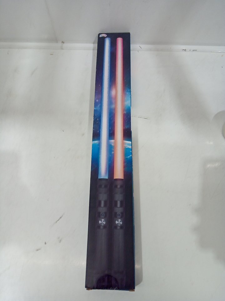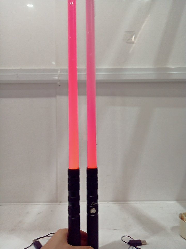 The small clear piece that diffuses the light inside the lightsaber blade is loose on one of the sabers. Tested for power and sound. There are some scuffs on the plastic. (SEE PHOTOS)