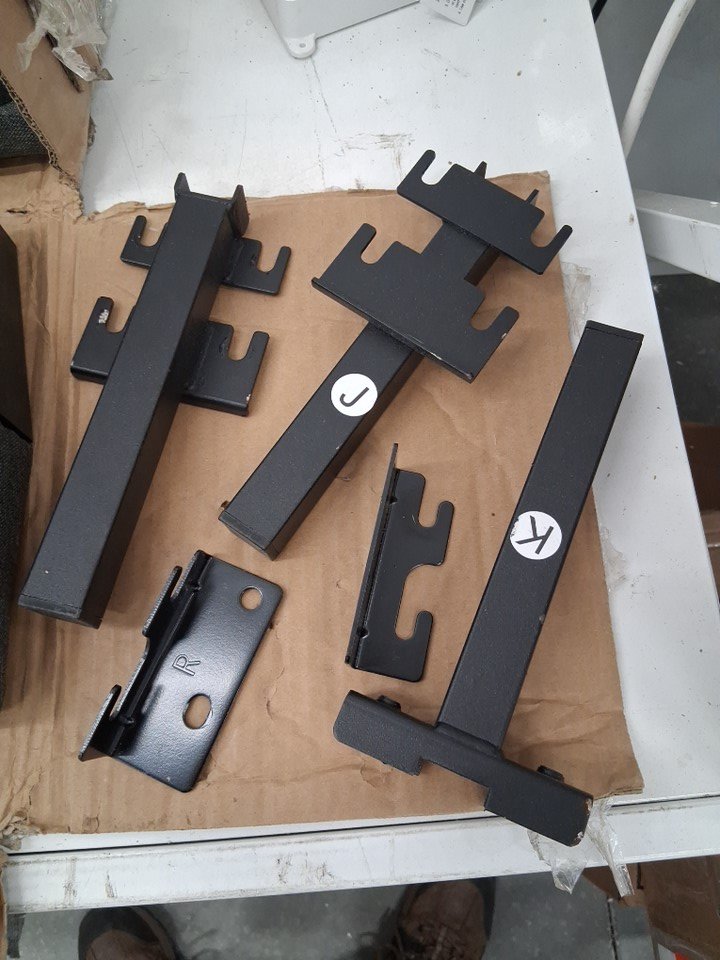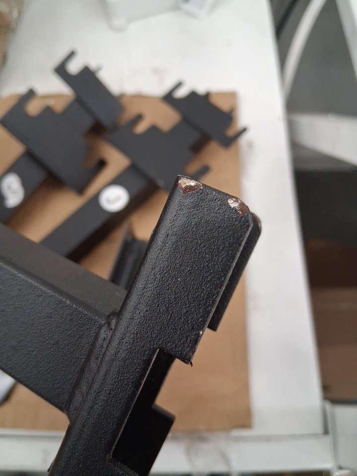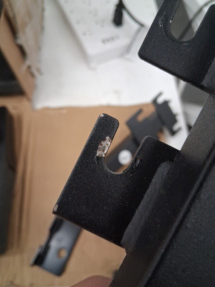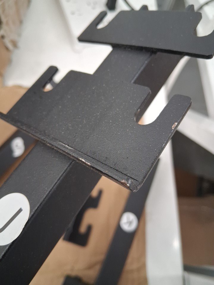 There are some scuffs on some of the connecting metal pieces as a result of shipping - see photos. Customer may also need to supply some additional hardware (screws, etc) in order to complete assembly, as there appears to be no hardware included in the box.