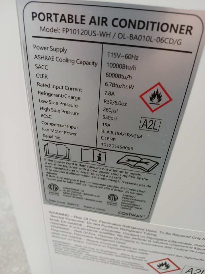 Costway Portable Air Conditioner with remote - 10000 BTU - White - (Model: FP10120US-WH)