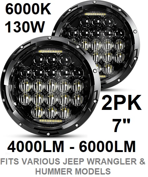 2pk cowone drl bulb 5d lens led headlights - compatible with various jeep wrangler and hummer models - 130w - 4000lm to 6000lm - 6000k - 7"