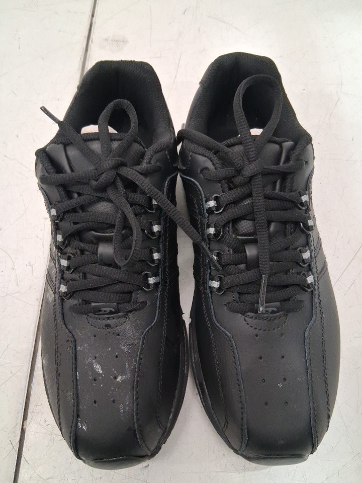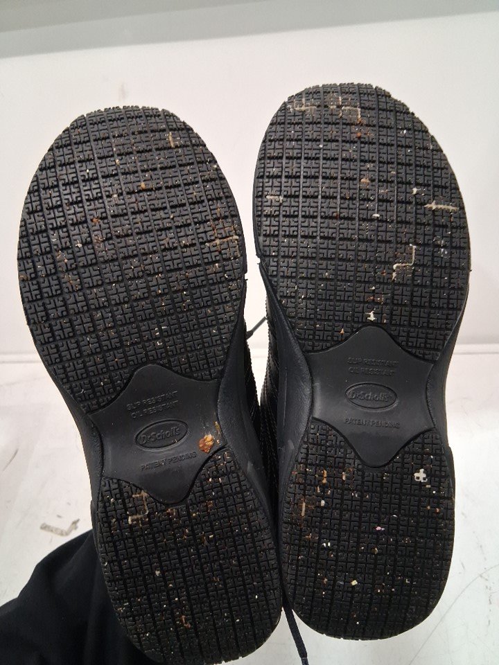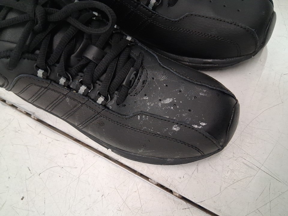 Item shows signs of previous use such as like white markings on surface of one shoe, and dirt/debris on bottom of soles.
