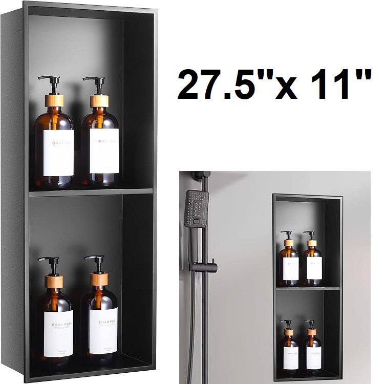 Rectangular Recessed Wall Storage Shower Shelf Wall Niche - 304 Stainless Steel, No Tile Needed - black
