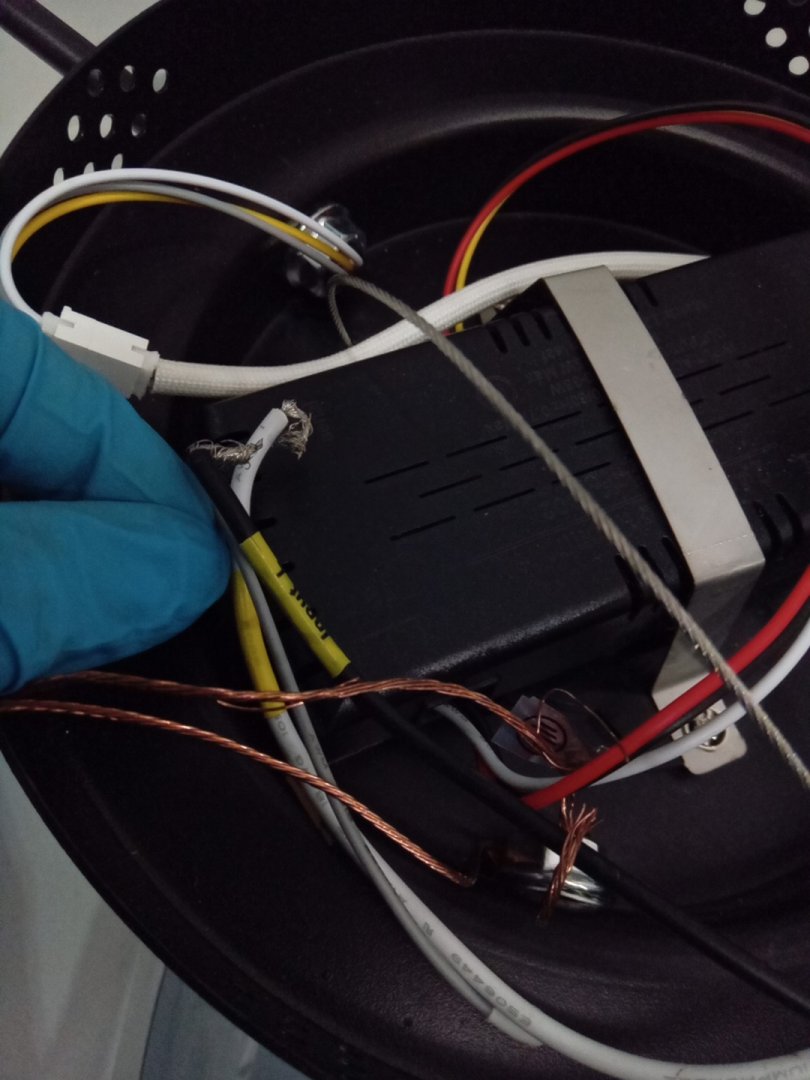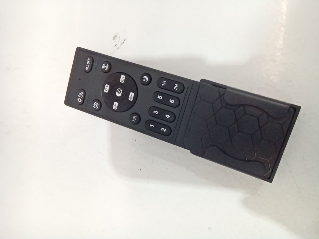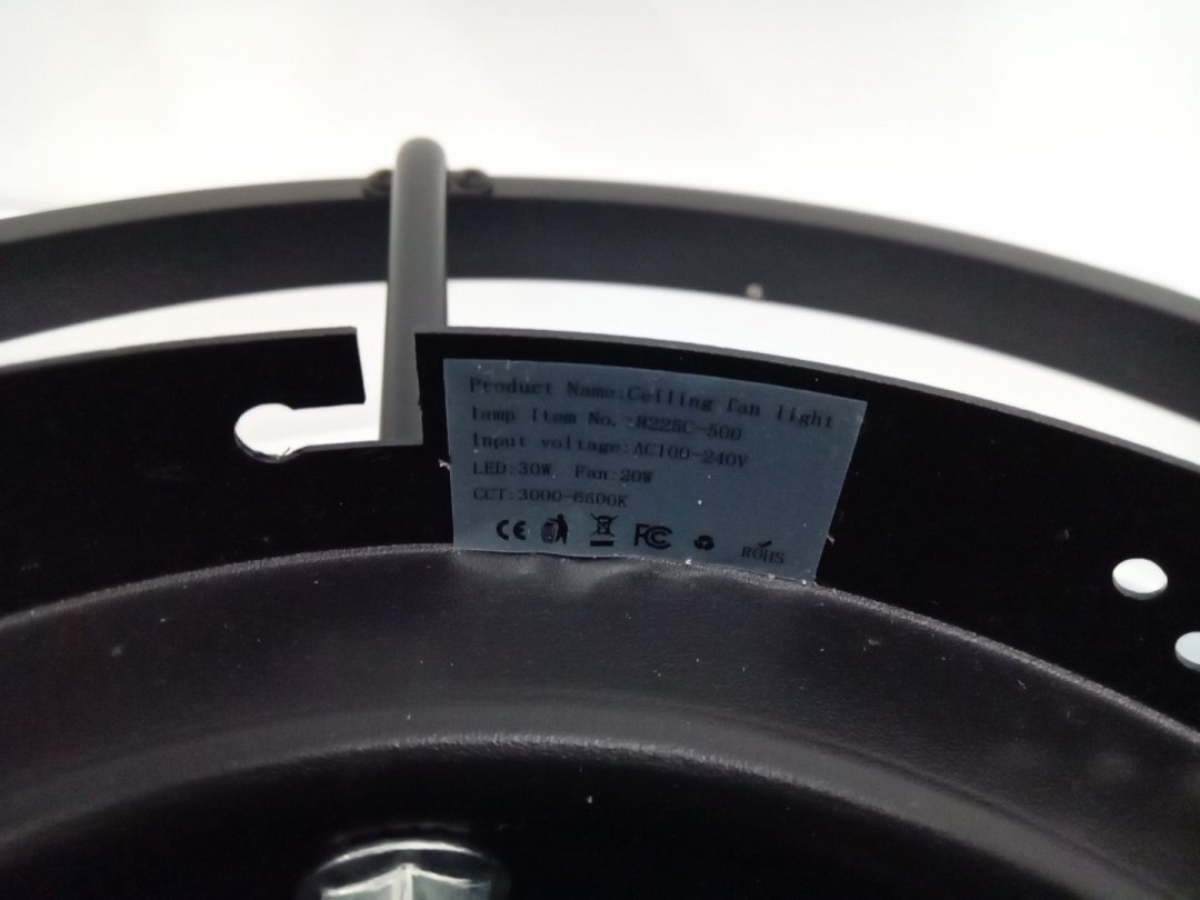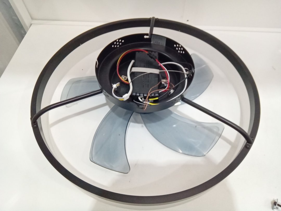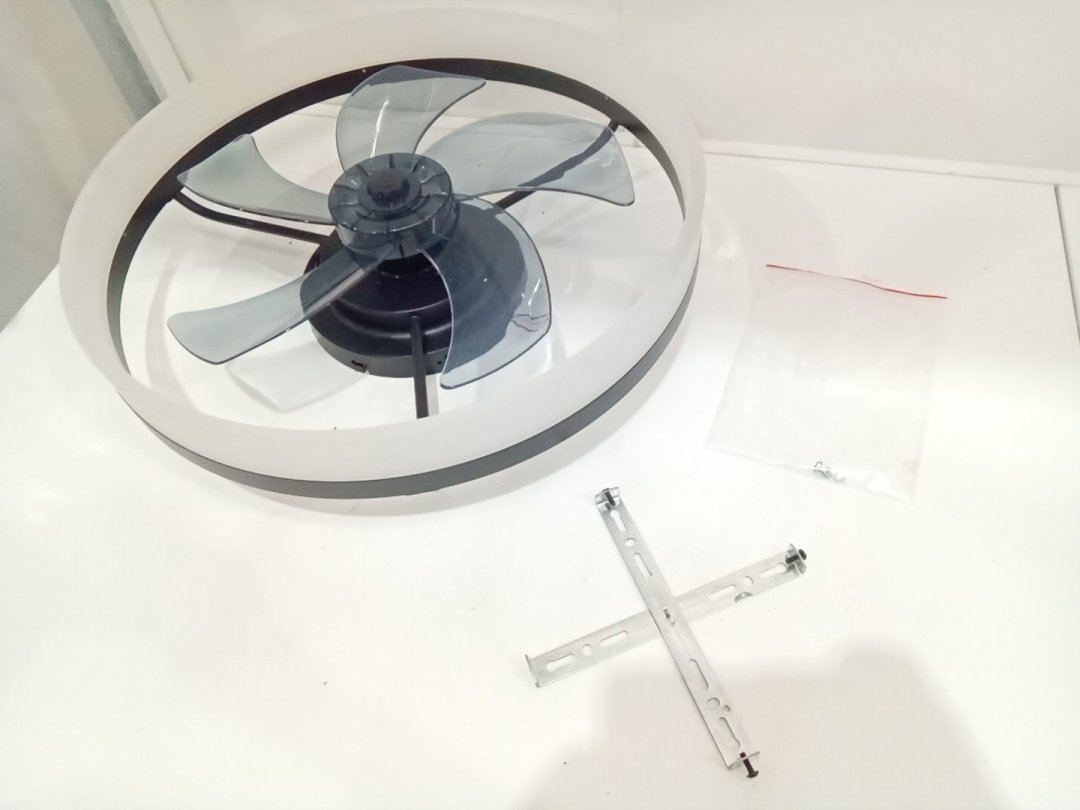 Smudges on fan blades, scuffs on remote, and markings on wires from prior use. Set is missing the generic hardware used for installation, which are replaceable. Please see photos.