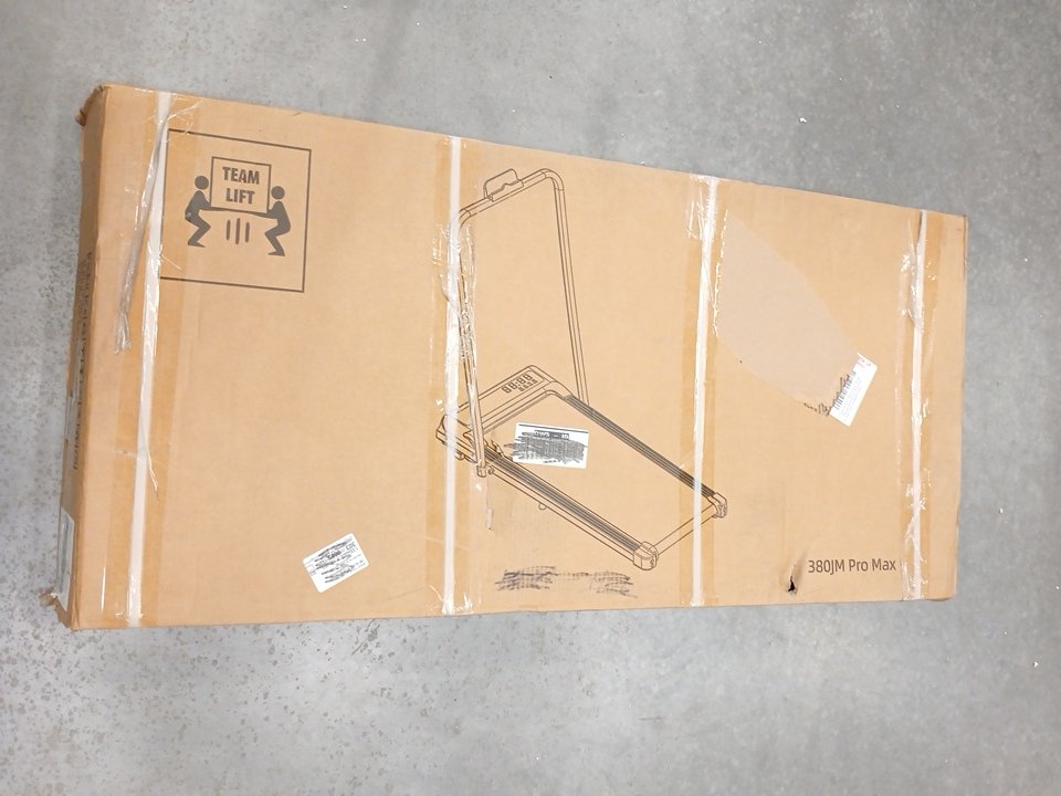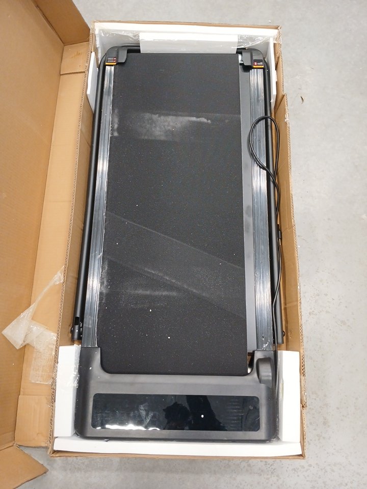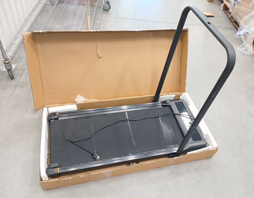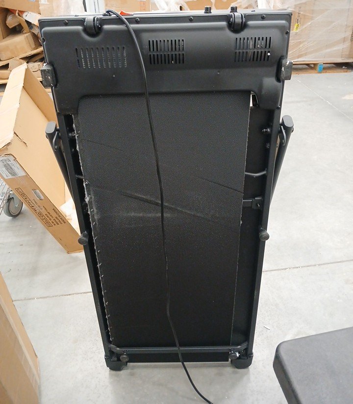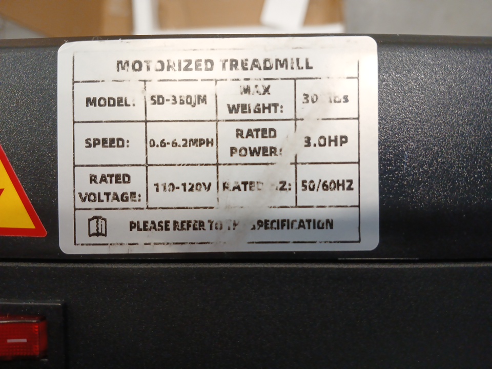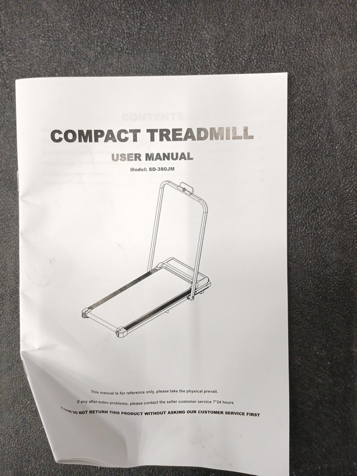 Our handle looks different than the cover image. The tread is misaligned too far to one side, the tread has fraying on the sides, the tread has white marks on it, and the treadmill has oil stains. This item has been tested for power