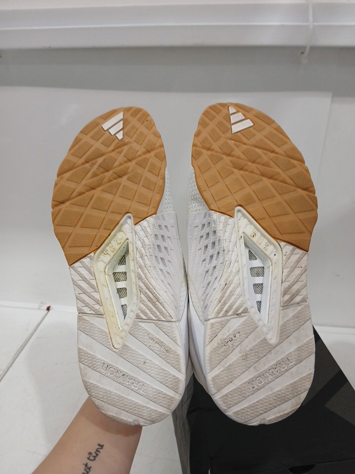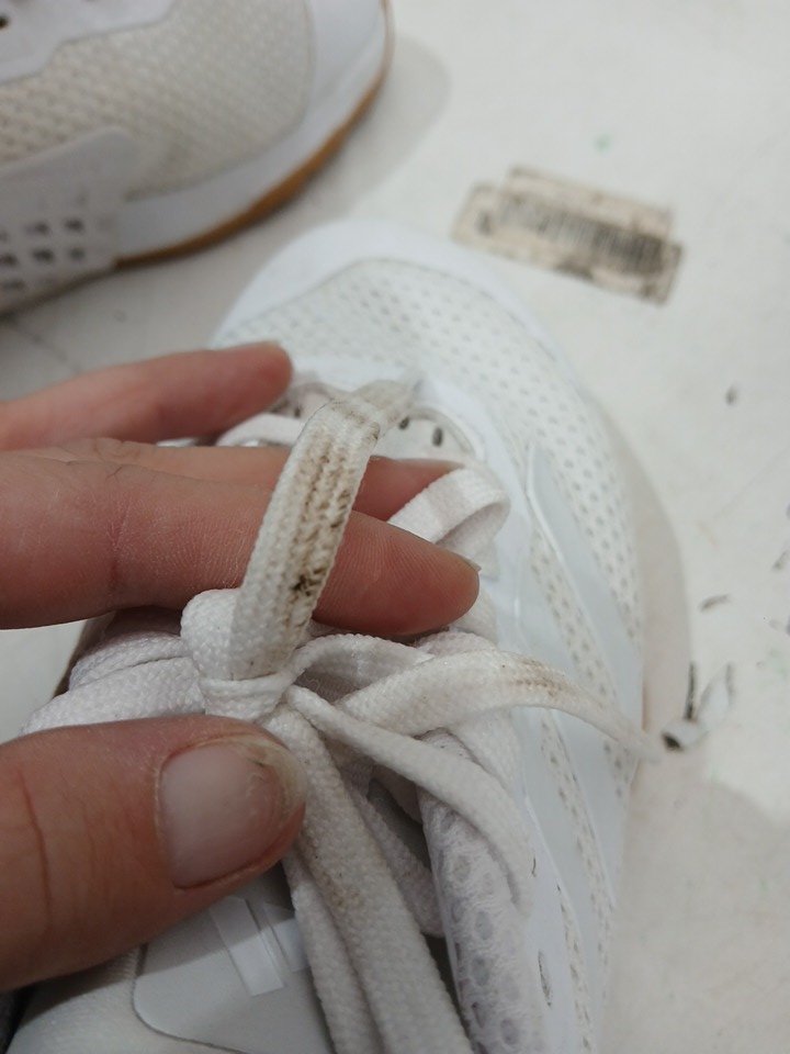 Has some wear on the soles. The laces are slightly discolored.