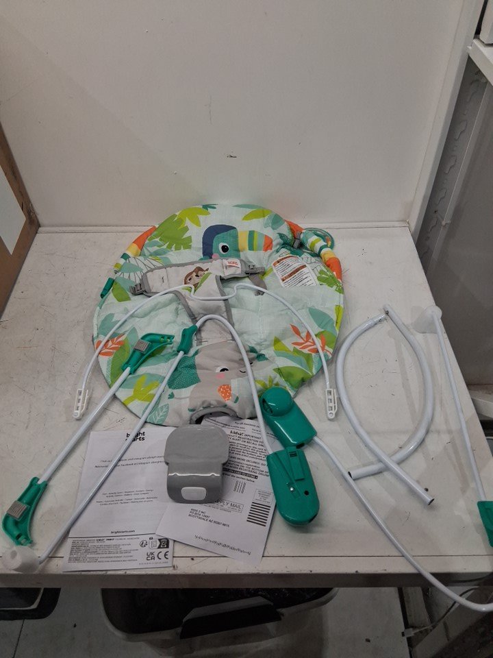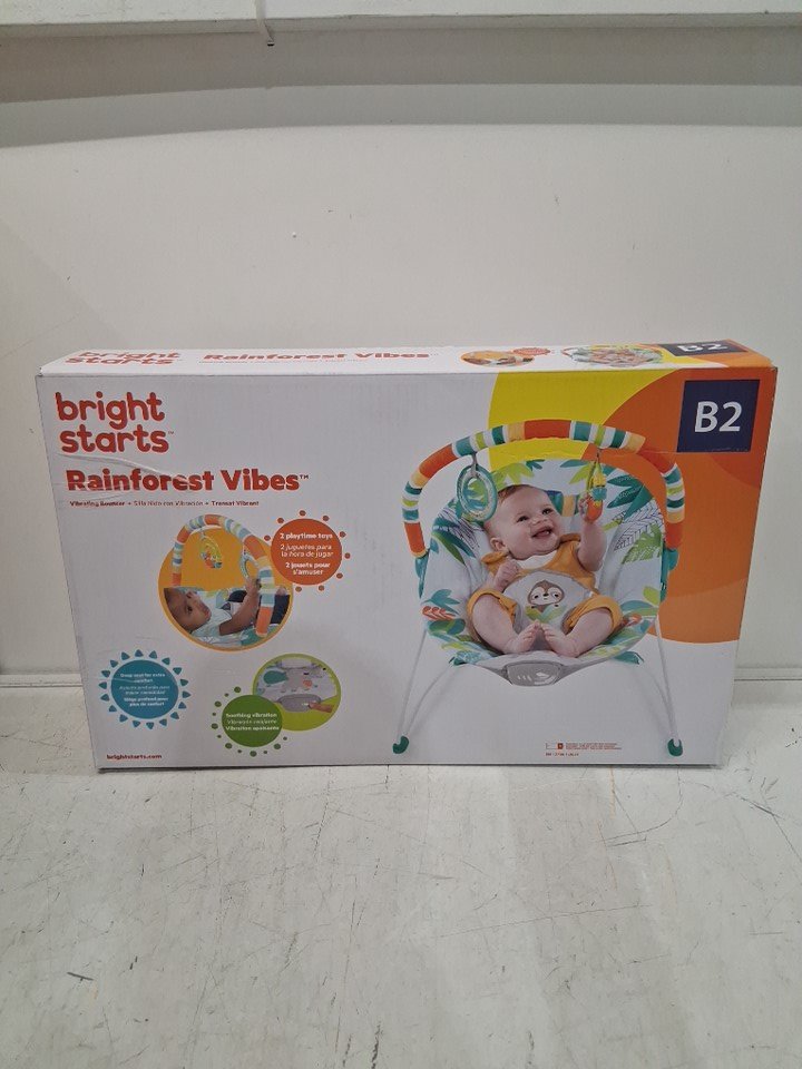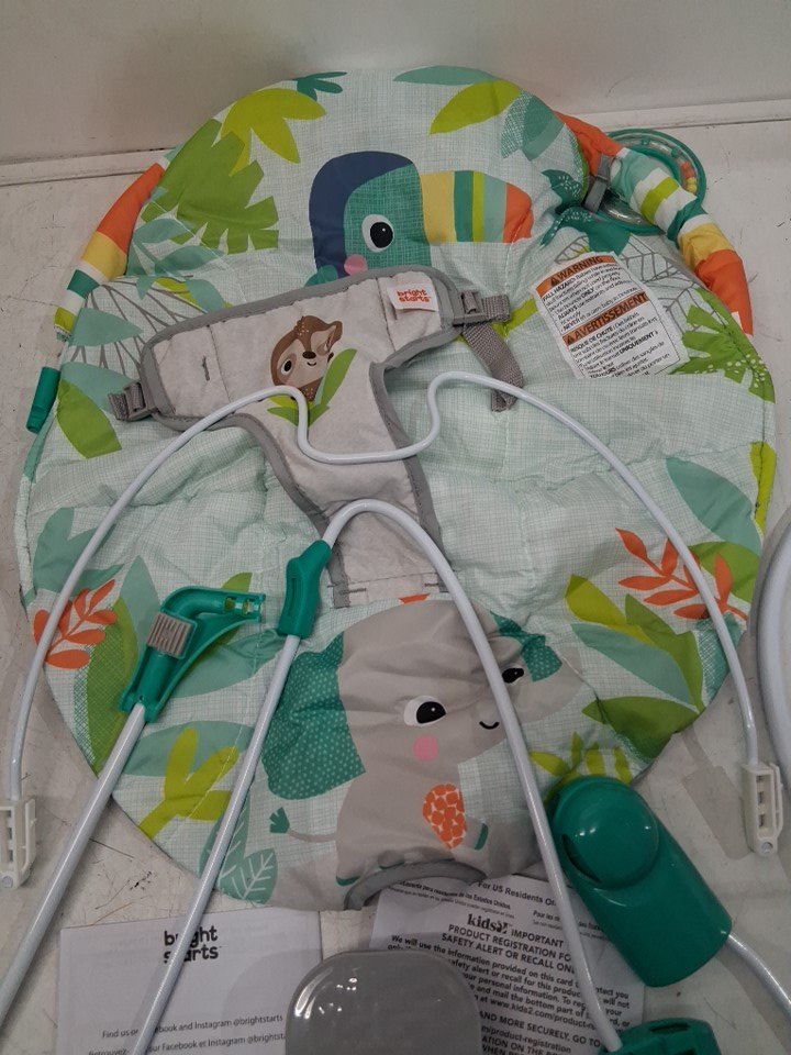 BRIGHT STARTS RAINFOREST VIBES PORTABLE 3-POINT HARNESS VIBRATING BOUNCER WITH TOY-BAR - RAINFOREST VIBES (MODEL: 12227)