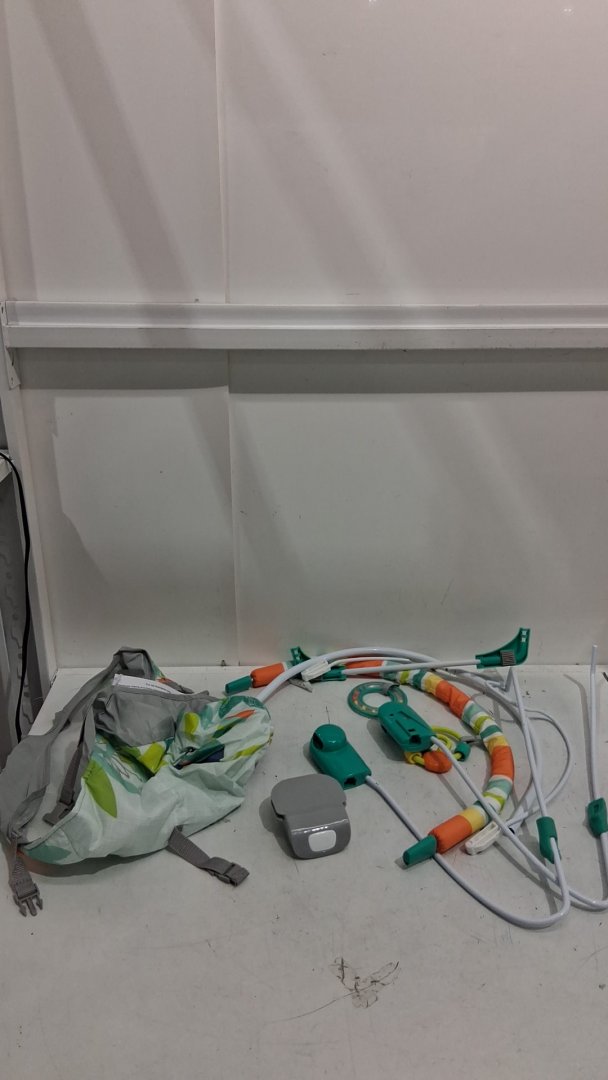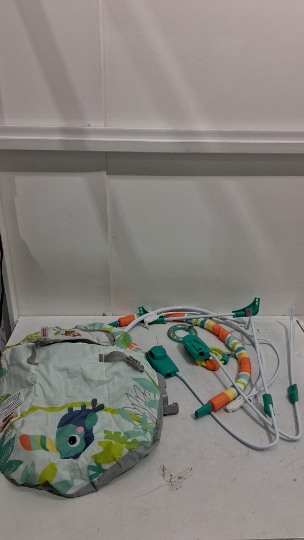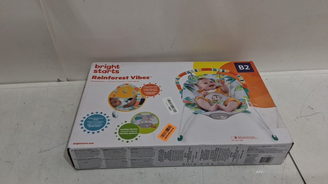 BRIGHT STARTS RAINFOREST VIBES PORTABLE 3-POINT HARNESS VIBRATING BOUNCER WITH TOY-BAR - RAINFOREST VIBES (MODEL: 12227)