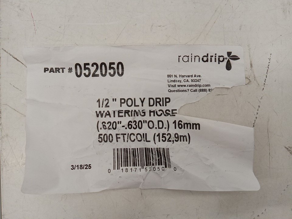 RAIN BIRD 1/2" POLY DRIP WATERING HOSE, 500FT COIL (MODEL: 052050)