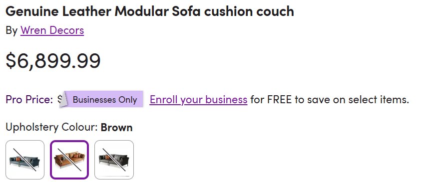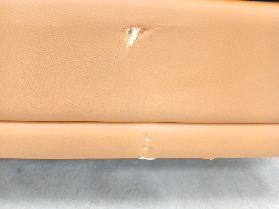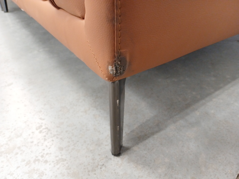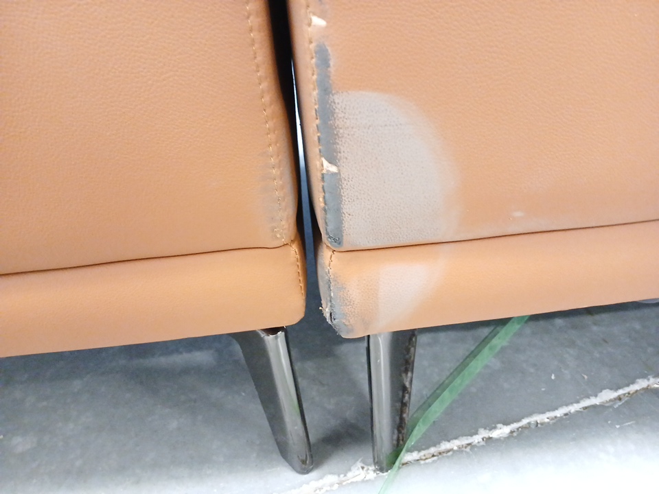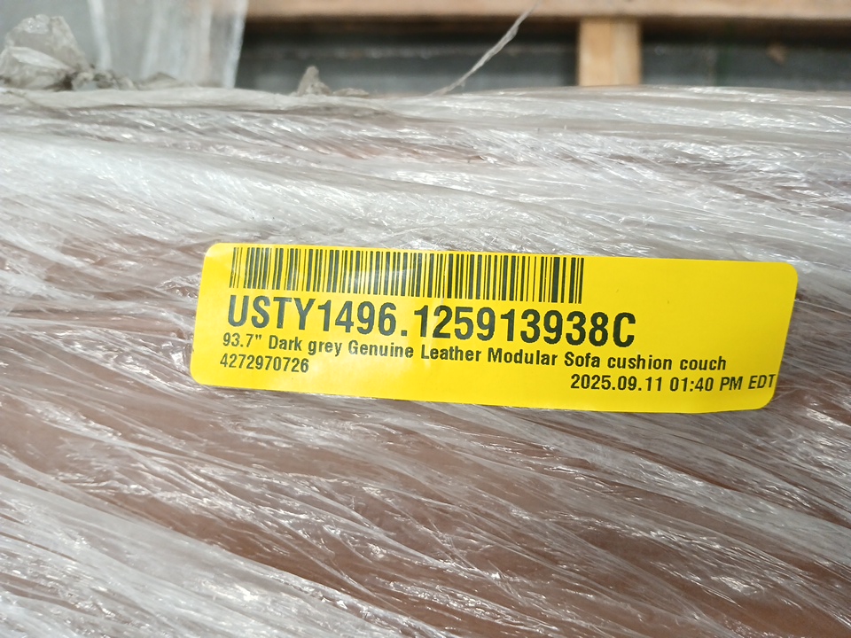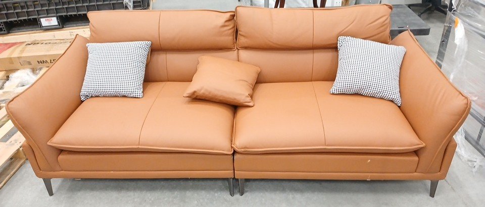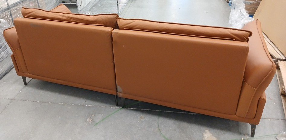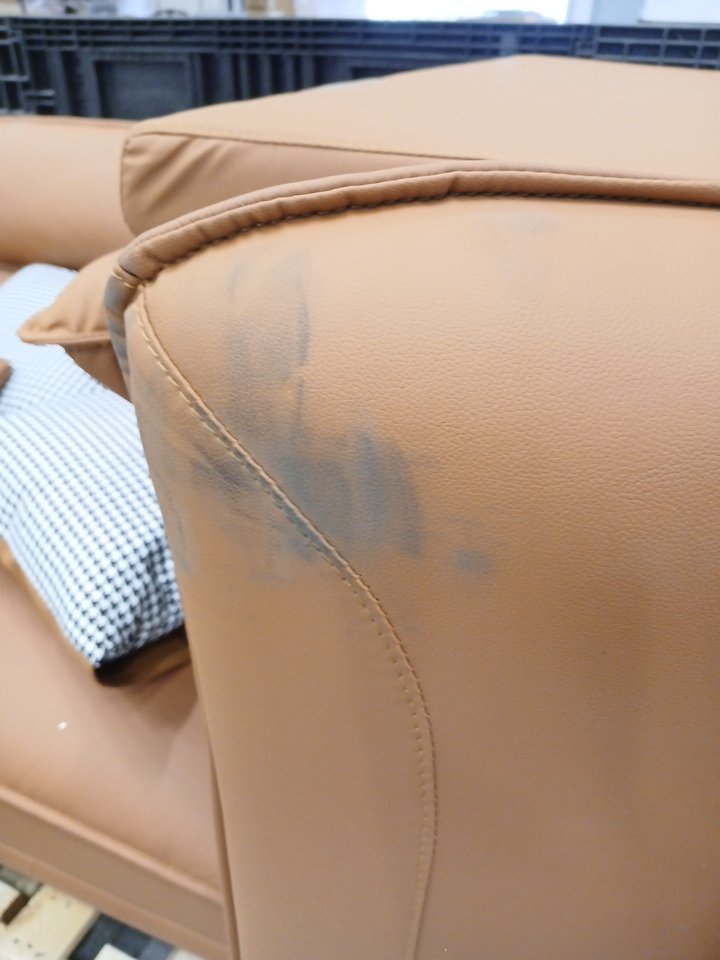 Our item does not come with the pillows in the image; our pillows are different. This item has many damage spots that have black marks throughout it. This item has some scuffs on its legs. This item is a modular couch and can split in the middle because it is not all one piece.