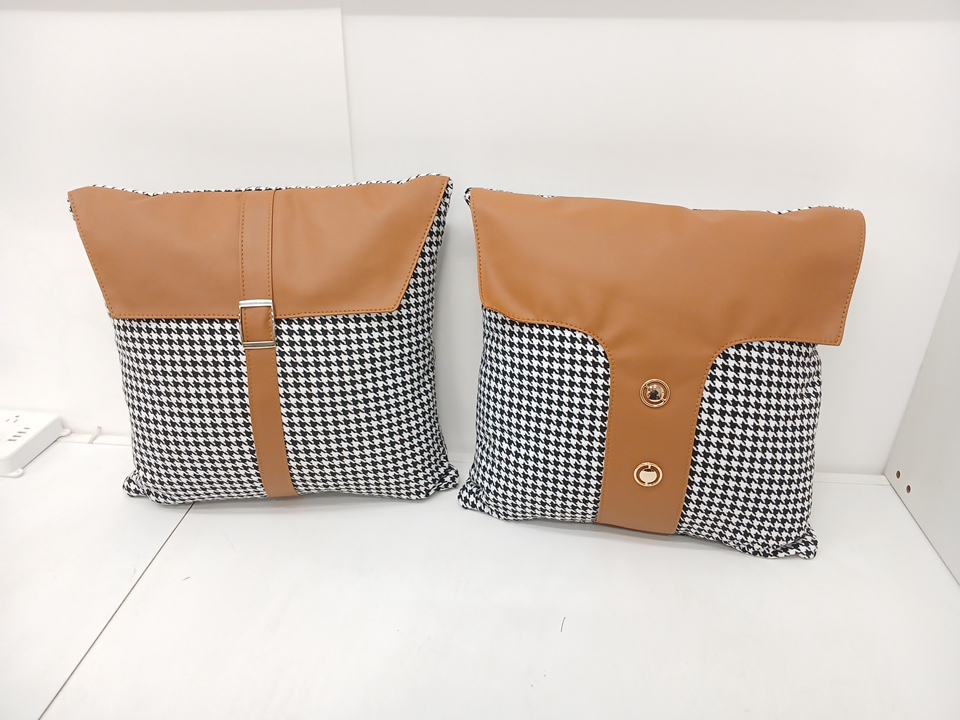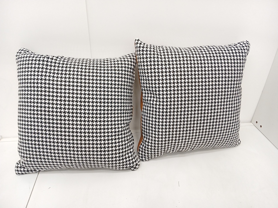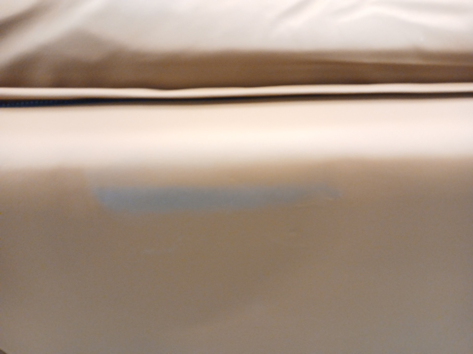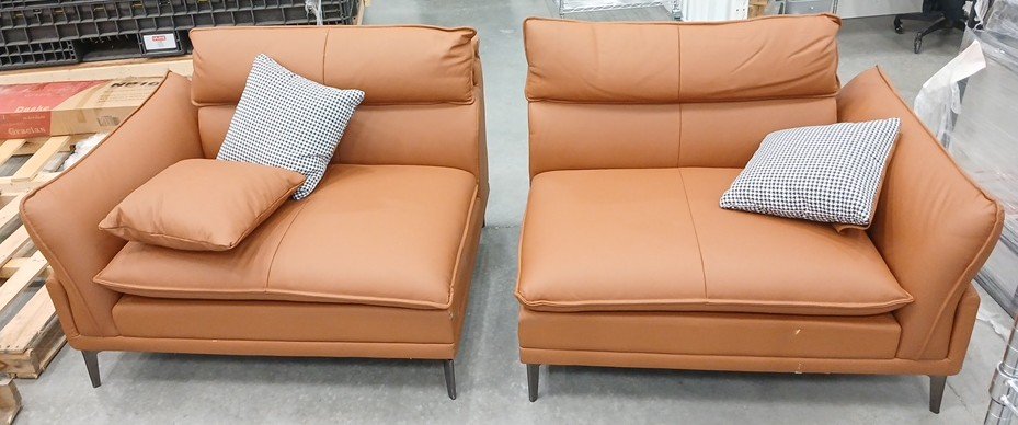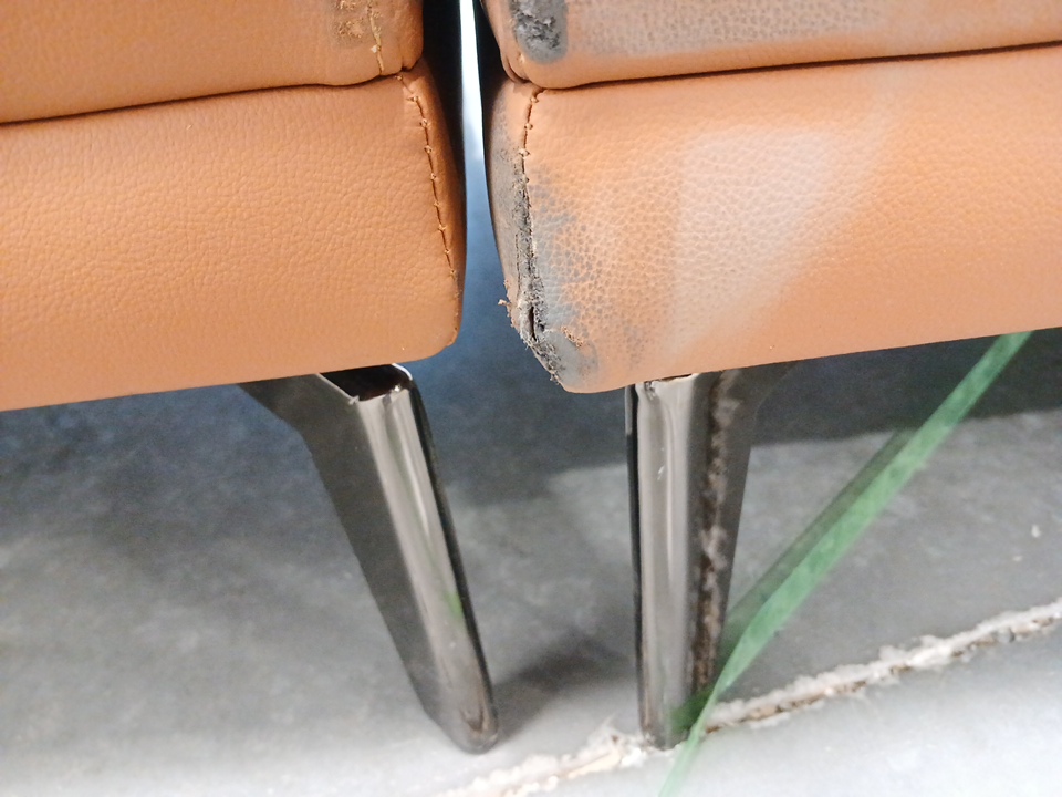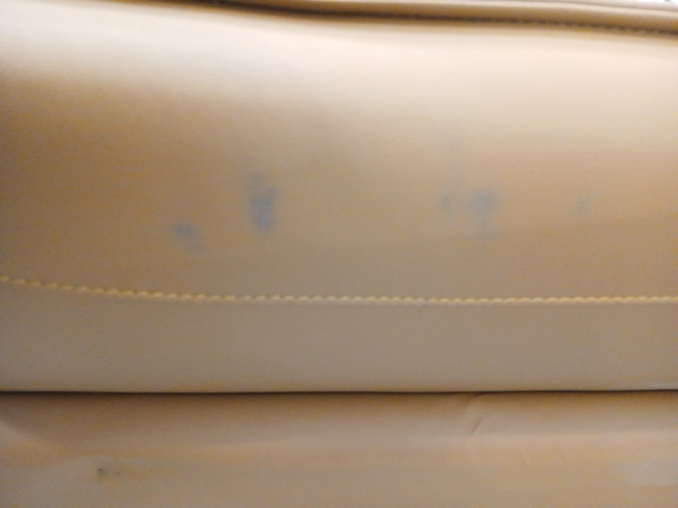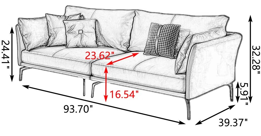 Our item does not come with the pillows in the image; our pillows are different. This item has many damage spots that have black marks throughout it. This item has some scuffs on its legs. This item is a modular couch and can split in the middle because it is not all one piece.