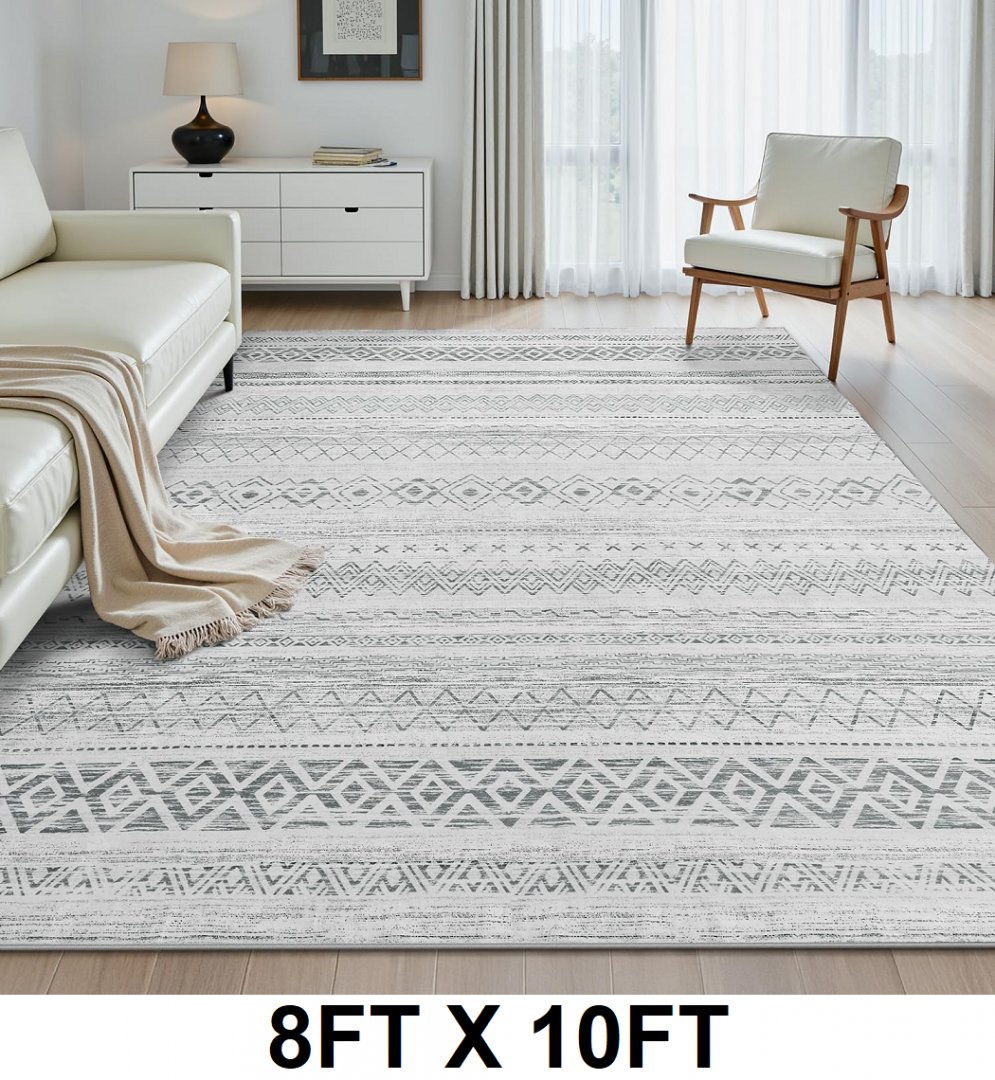 AMOAMI Area Rug with Ultra Soft Non-Slip Boho Distressed Moroccan Material, Machine Washable, Low-Pile Polyester and Rubber Backing - Grey - 8FT X 10FT