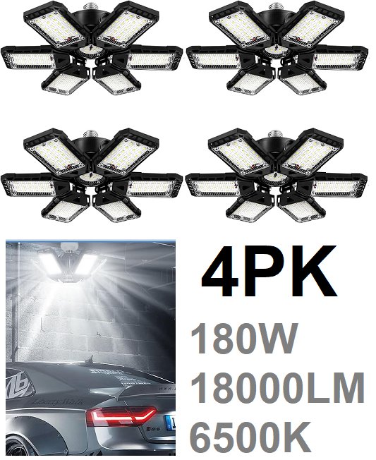4PK Aoretic LED Garage Lights Bulb with 6+1 Deformable Panels - E26/E27 - 180W - 18000LM - 6500K