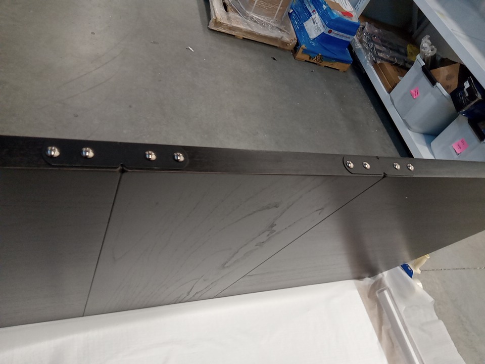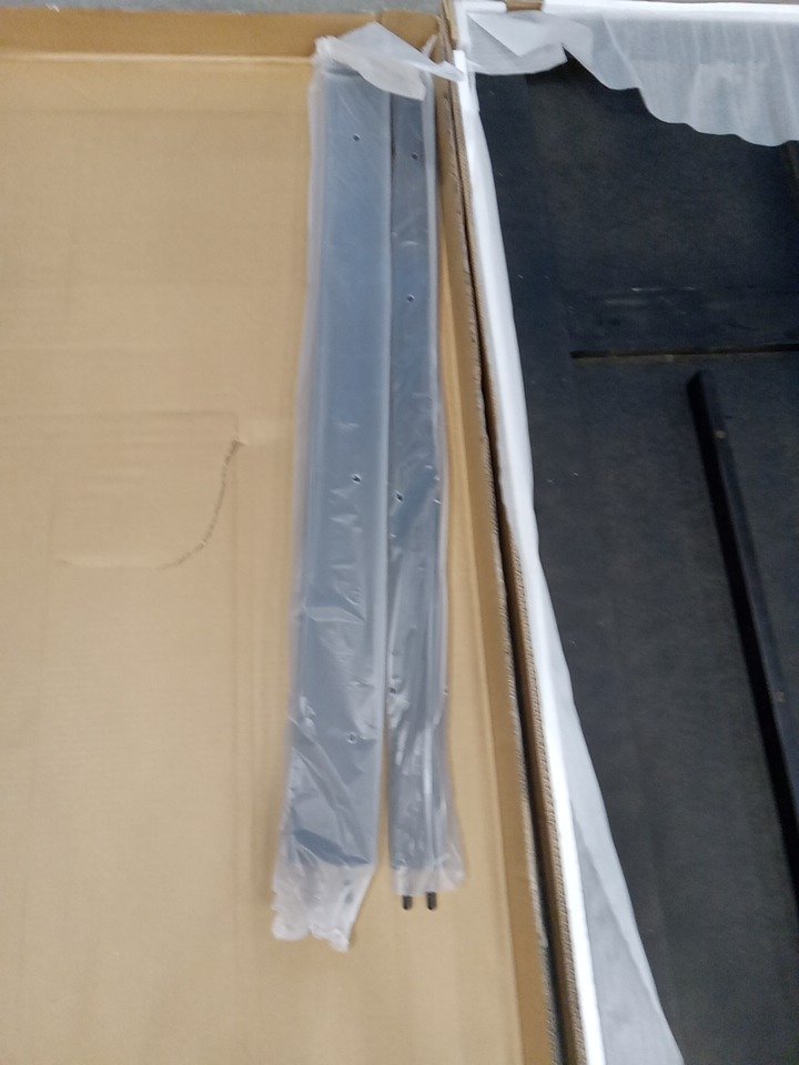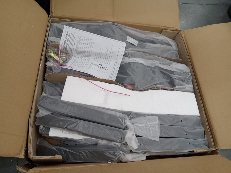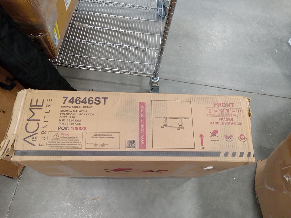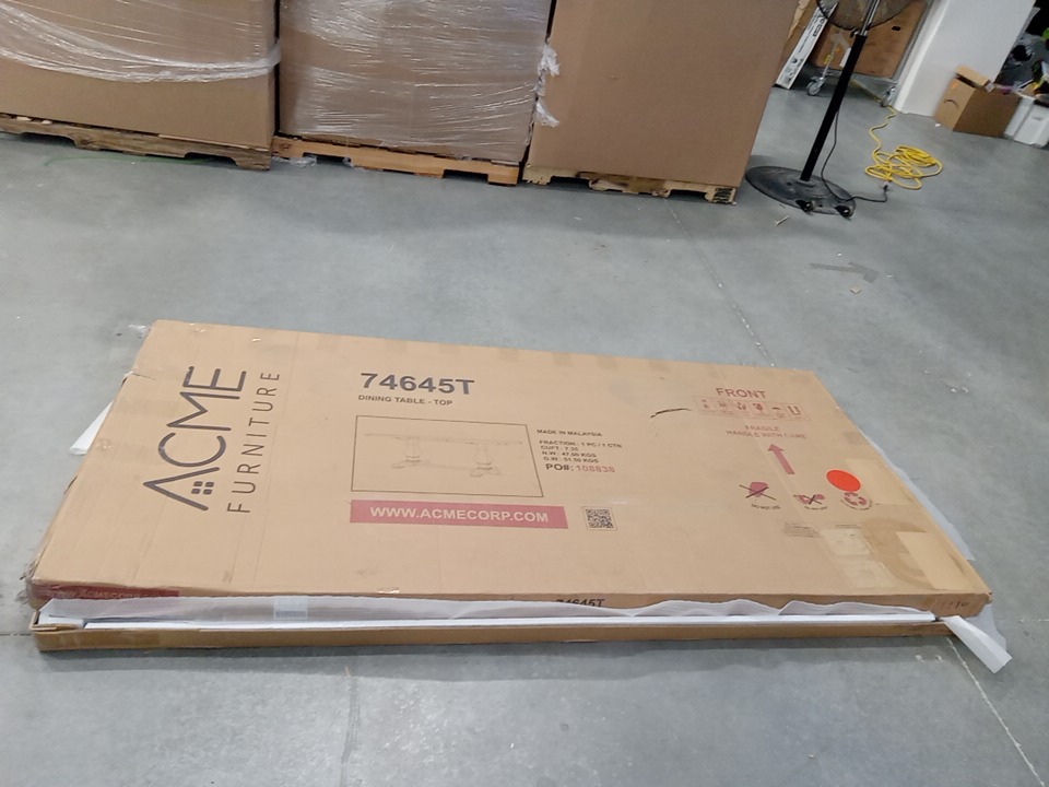 This item comes in 2 boxes. their are a few fraying and peeling spots on the bottom of this table top however this is not a cosmetic issue as when this item is assembled and in use the bottom of the table will not be visible. however the fraying and peeling spots on the legs will cause a cosmetic issue due to how it will be visible when this item is assembled. this seems to be due to shipping and handling. all vital parts for assembly are present. see photos below.