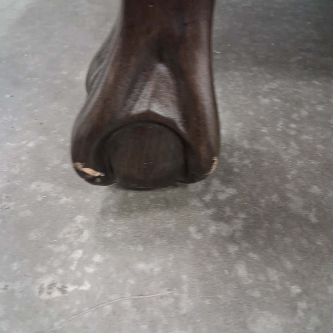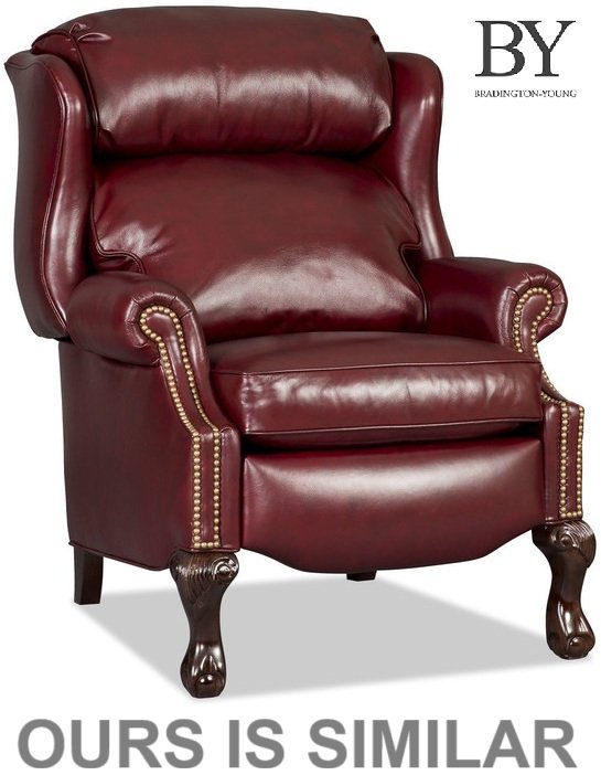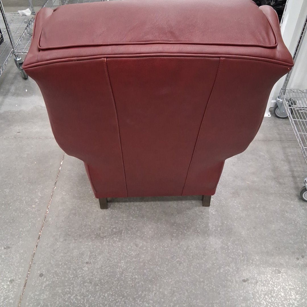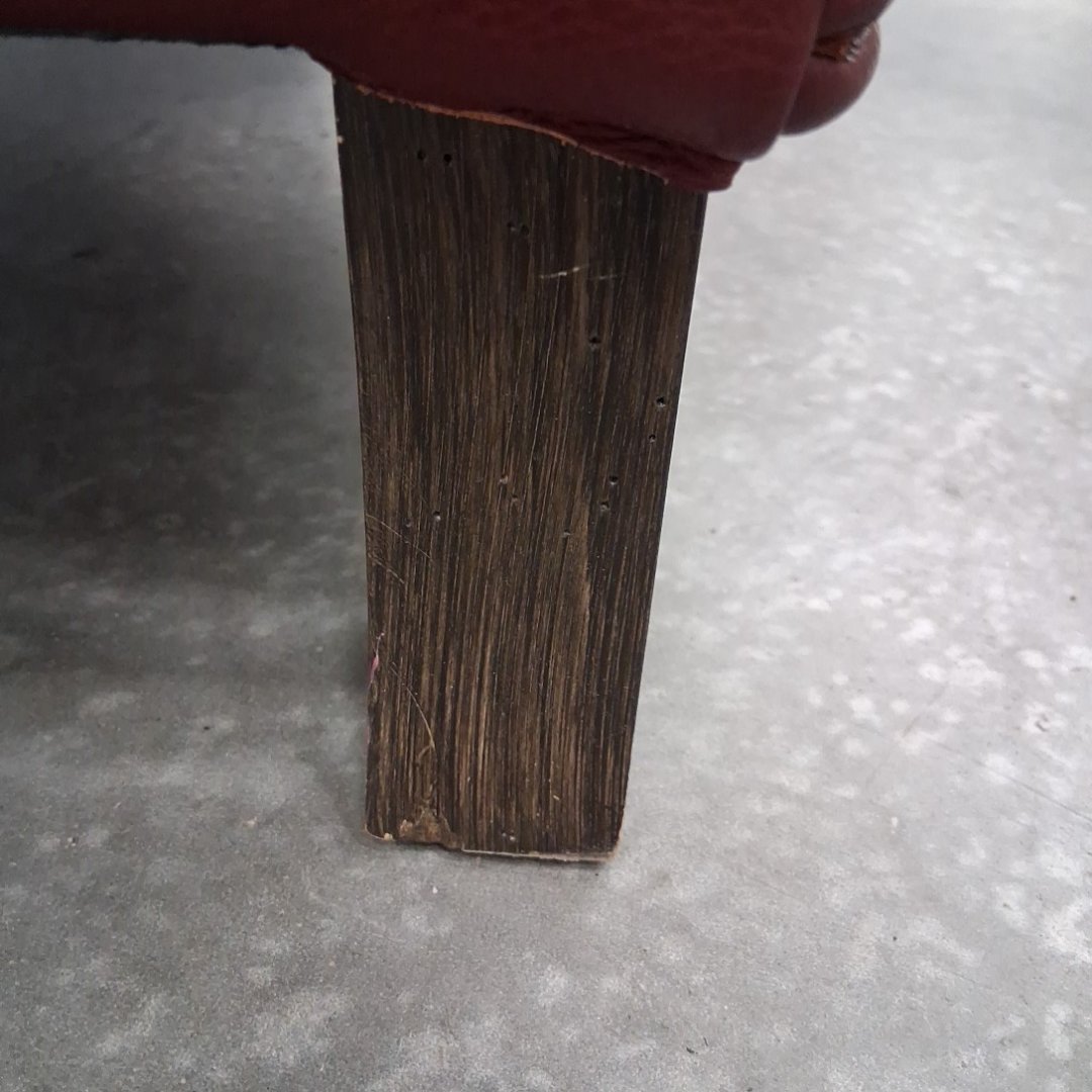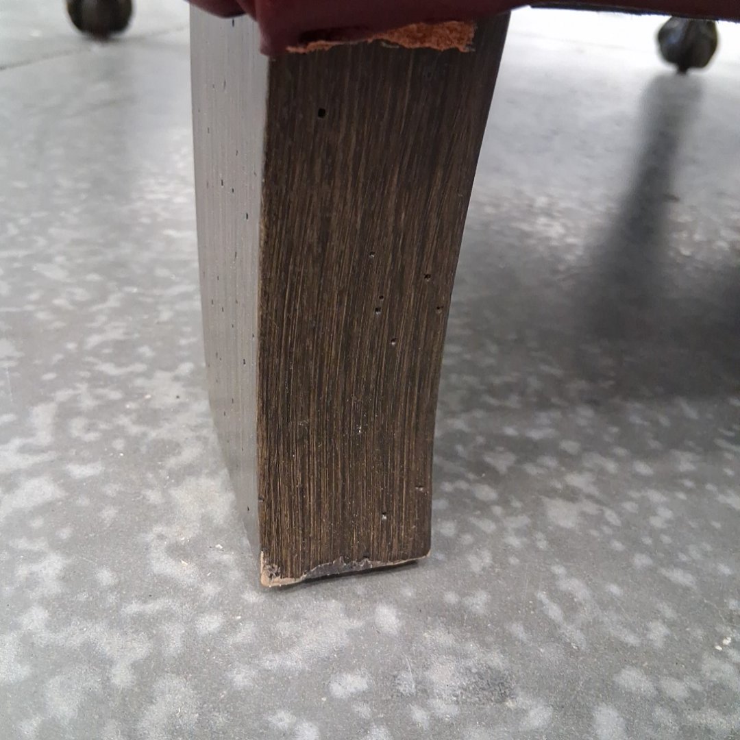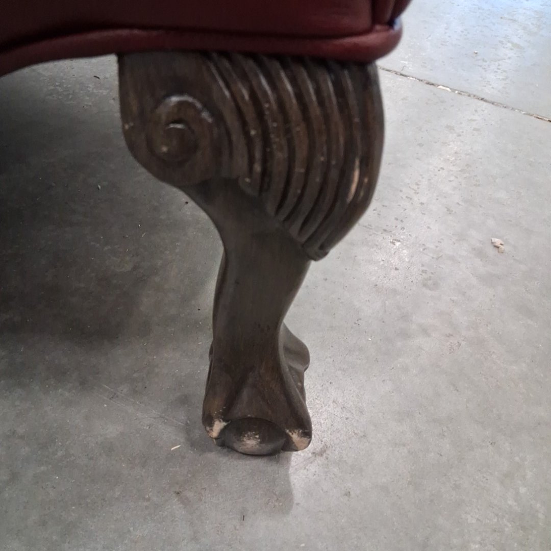 Please note, ours is burgundy and does not have the studded nails. The feet have scuffs on them. There are also a couple minor scuffs on the back at the top of the chair. (see photos)