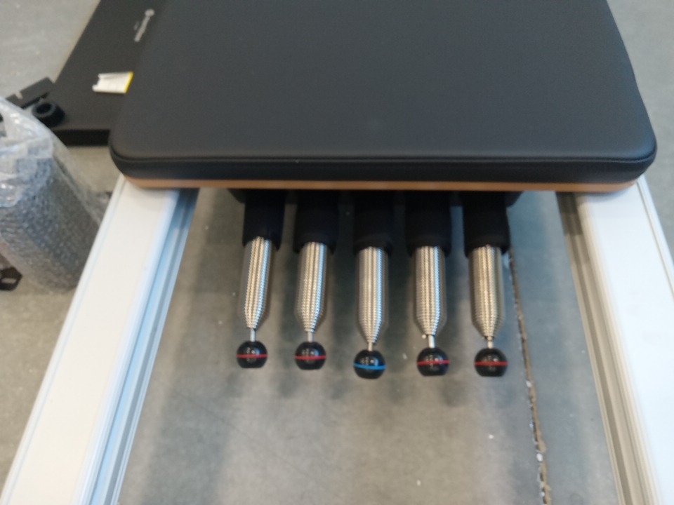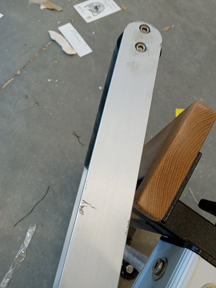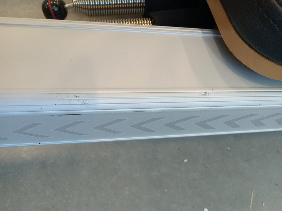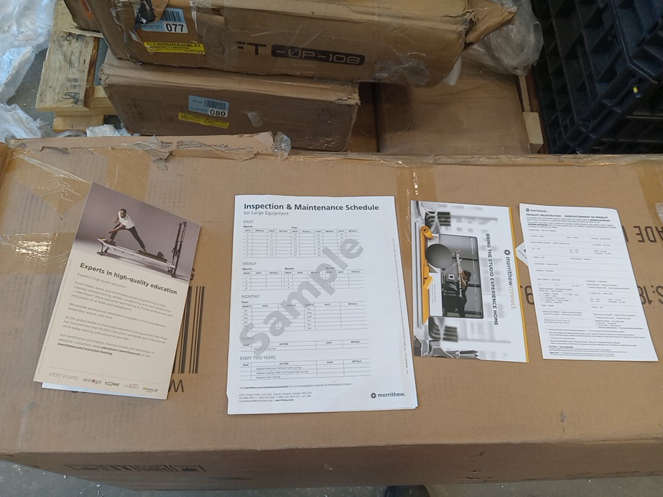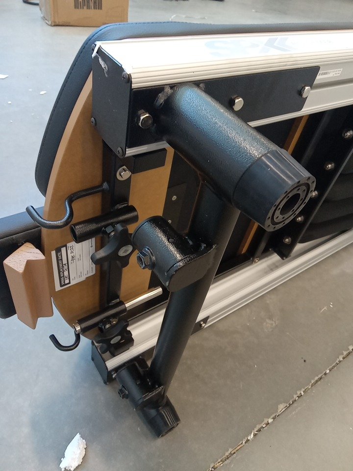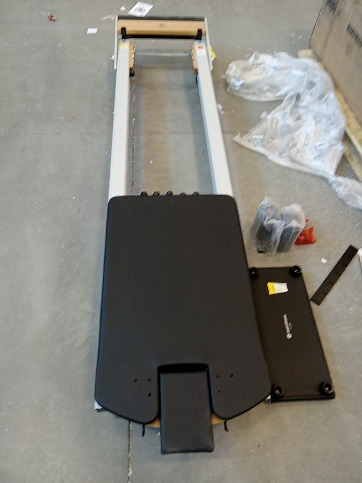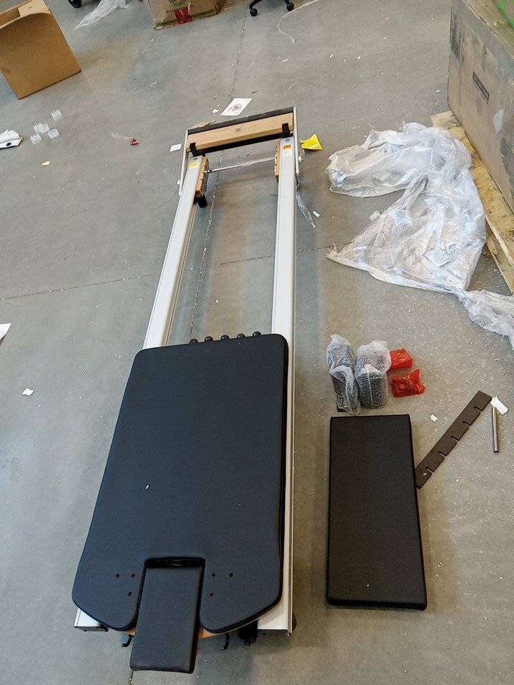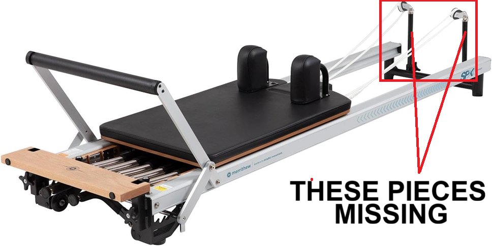 upon inspection we have found some scuffs, scratches and blemishes on the metal aluminum and the feet of the spx reformer and we have found a cut on the padded platform extender. this seems to be due to shipping and handling. there is some dust on this item from shipping and handling / our warehouse. their are no physical signs of prior light use however we have found a "spring replacement date" sticker on this item, this may be and indication that this item has been previously used. this item has been tested for its function and it is confirmed that all movable parts can fully extend without issue. See attached photos. Item is being marked with having issue as there are some pieces missing that customer will have to purchase/acquire in order to properly use the item. This is the two metal black posts with the reels and the rope that goes with it (see second photo for missing pieces).
