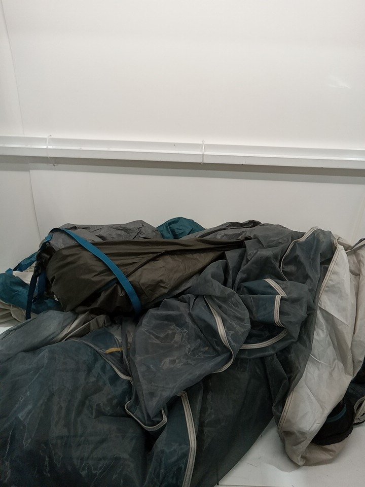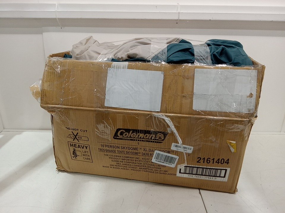 Some dirt/debris on it from previous use and poles show signs of wear on it. No manual present, unable to confirm if all pieces are present. Product is repackaged into coleman tent.