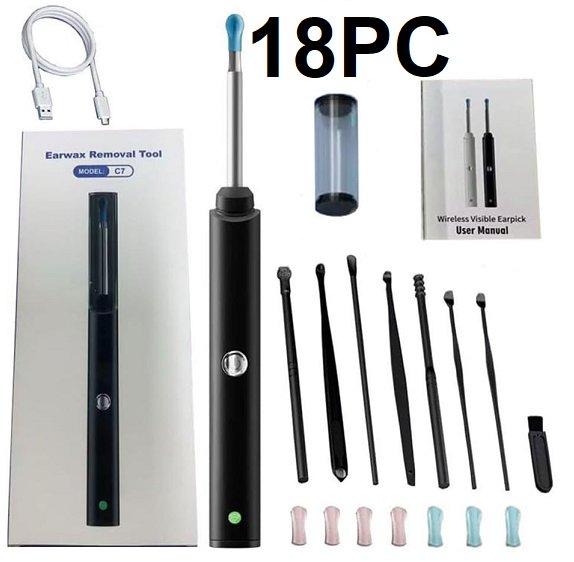 18PC EARWAX REMOVAL TOOL WITH INTERCHANGEABLE SPOONS - BLACK (MODEL: C7)