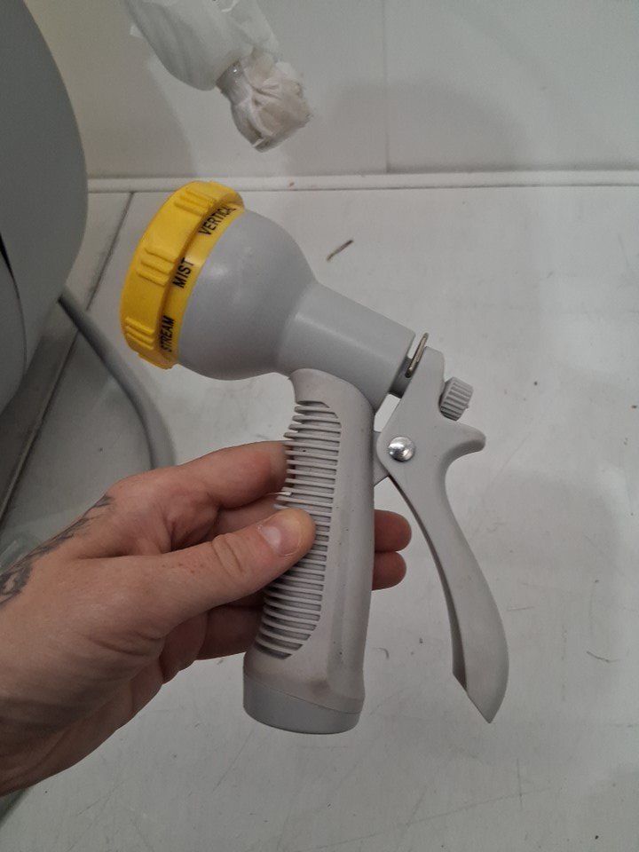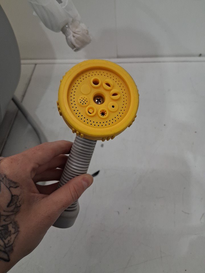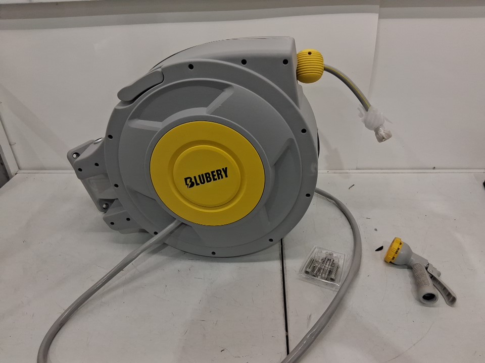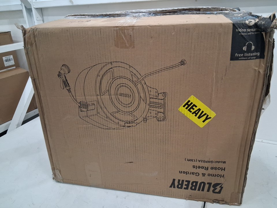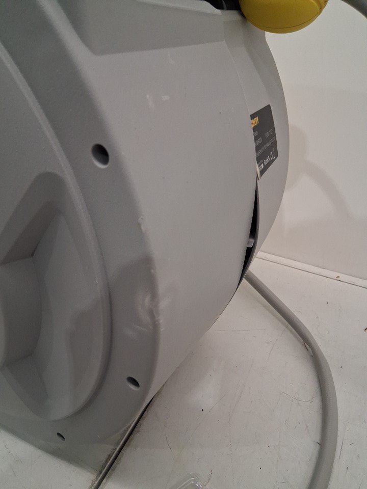 Casing for hose reel is distressed, with discoloration and warped from shipping damaged.