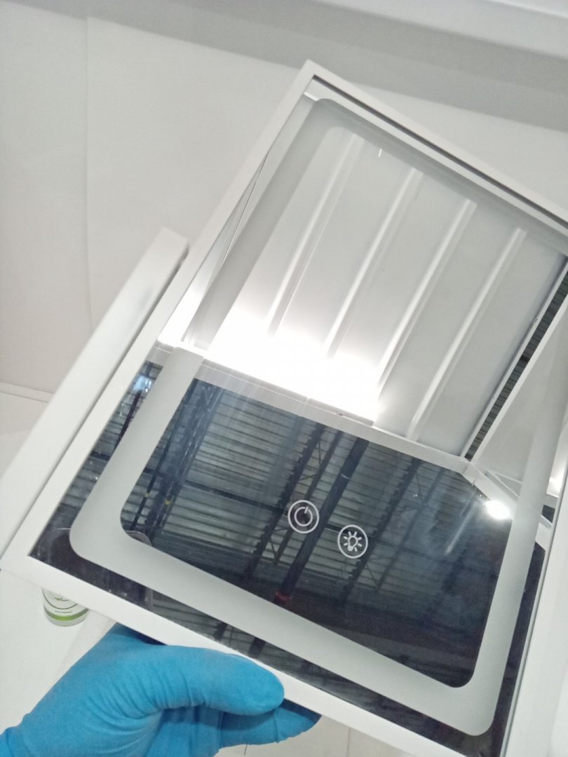 traces of dust and smudges, as well as a dark marking on the left arm from prior use.