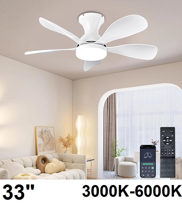 FUMLTP FLUSH MOUNT DC MOTOR Low Profile Ceiling Fans with Lights and Remote/APP Control -33" - 5 REVERSIBLE BLADES - 3000K-6000K- WHITE (MODEL:DC881)