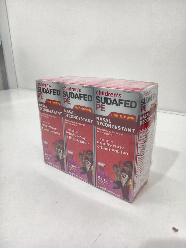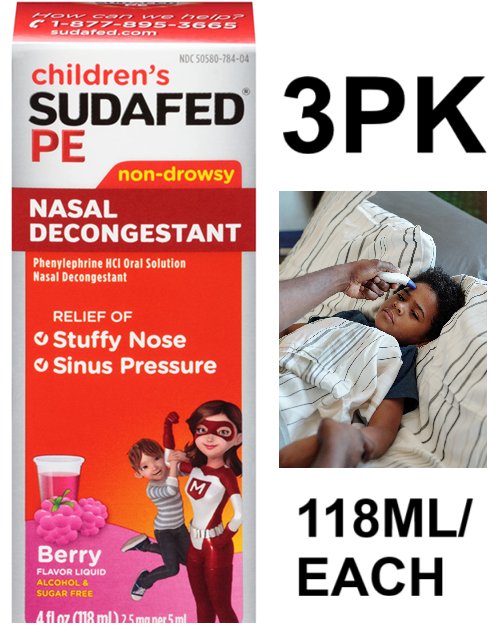 3PK **EXPIRES SOON** children's sudafed pe non drowsy nasal decongestant - berry flavour- 118ml/each