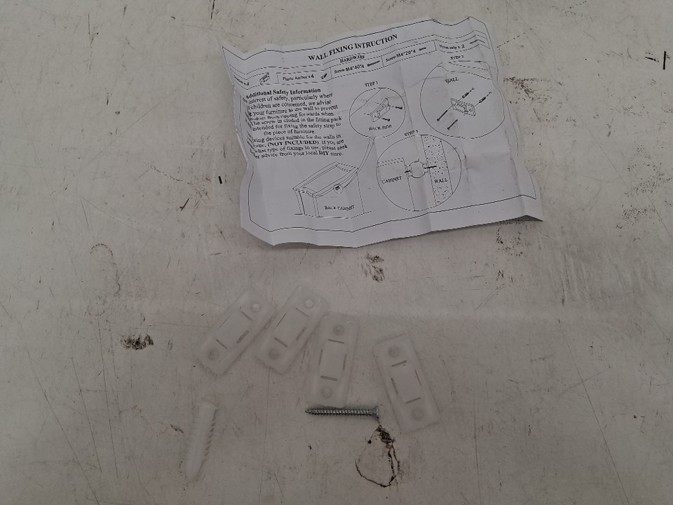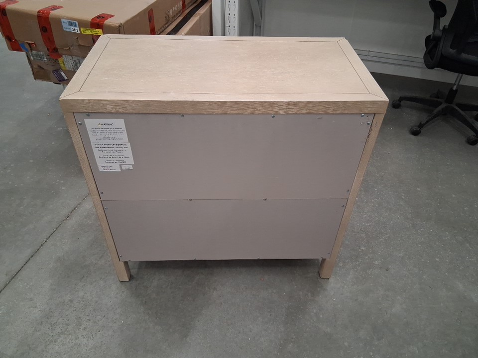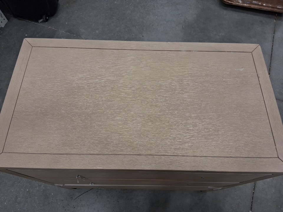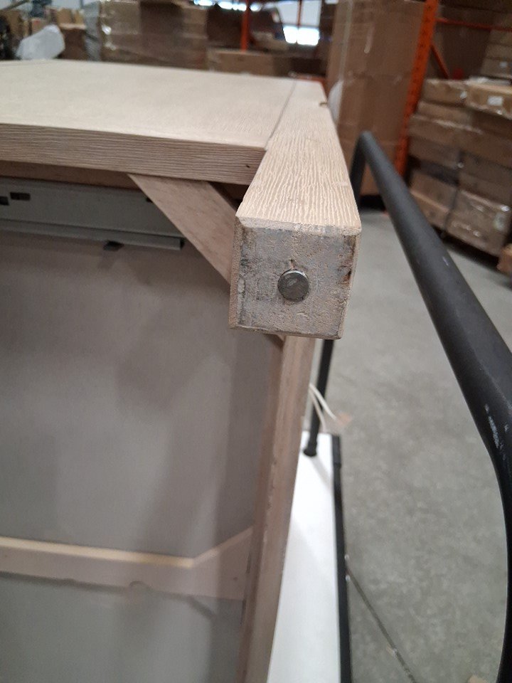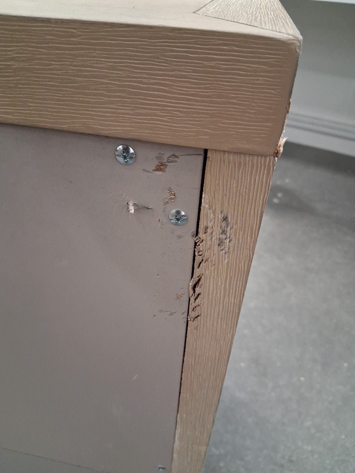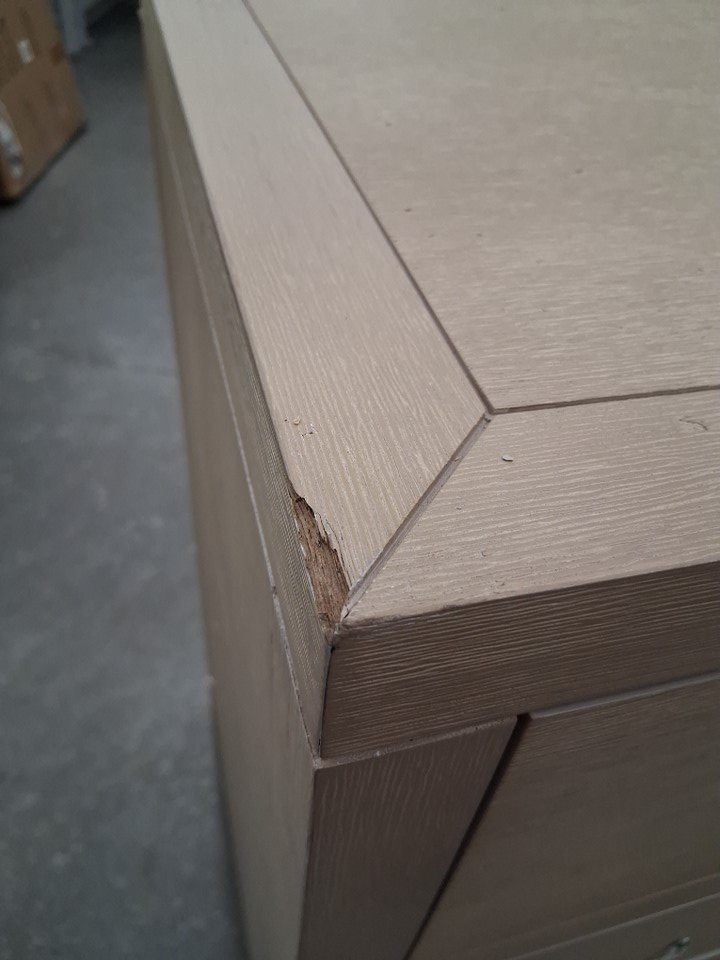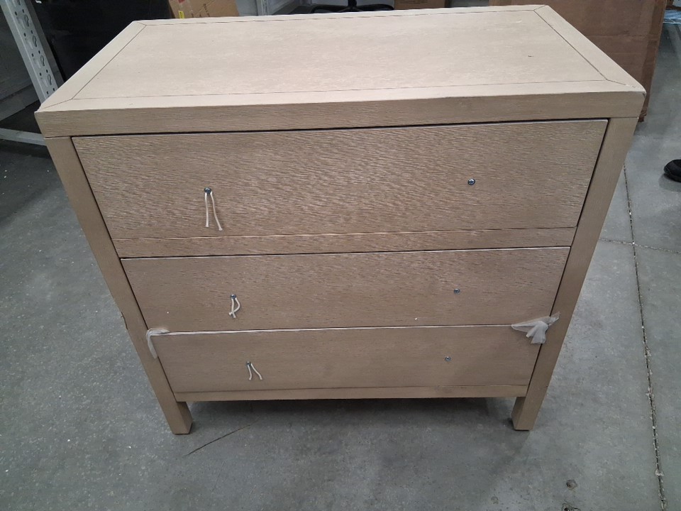 There are numerous scuffs on the top of the dresser, a small chip on the front left leg, and some chipping on the top right of the back side. One of the legs is also missing the bottom cap - see photos. Aside from this damage, appears unused. Some additional hardware (screws) may also be required in order to fully affix the dresser to a wall.