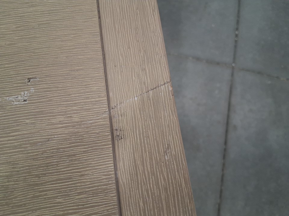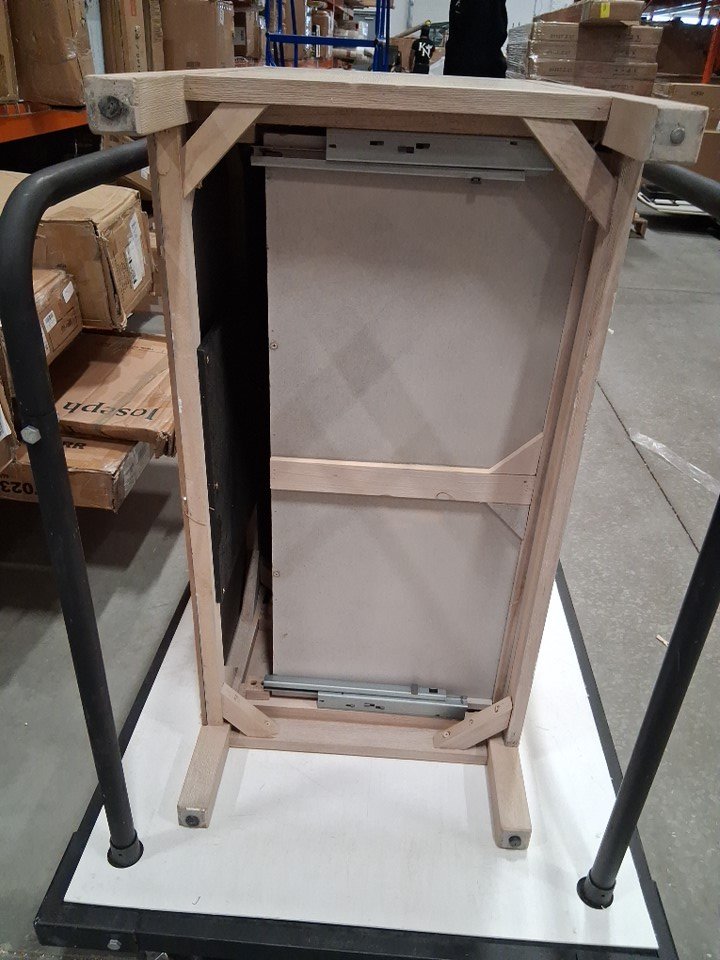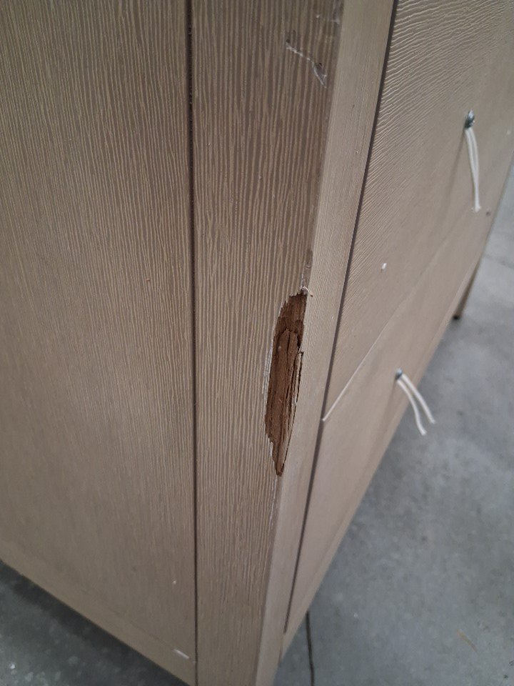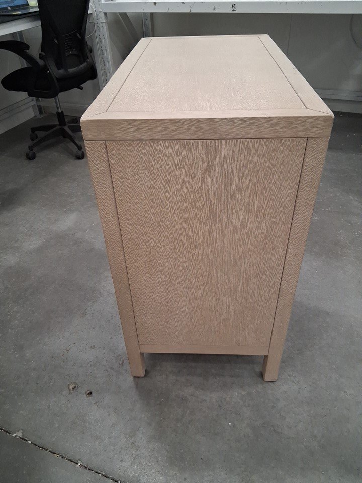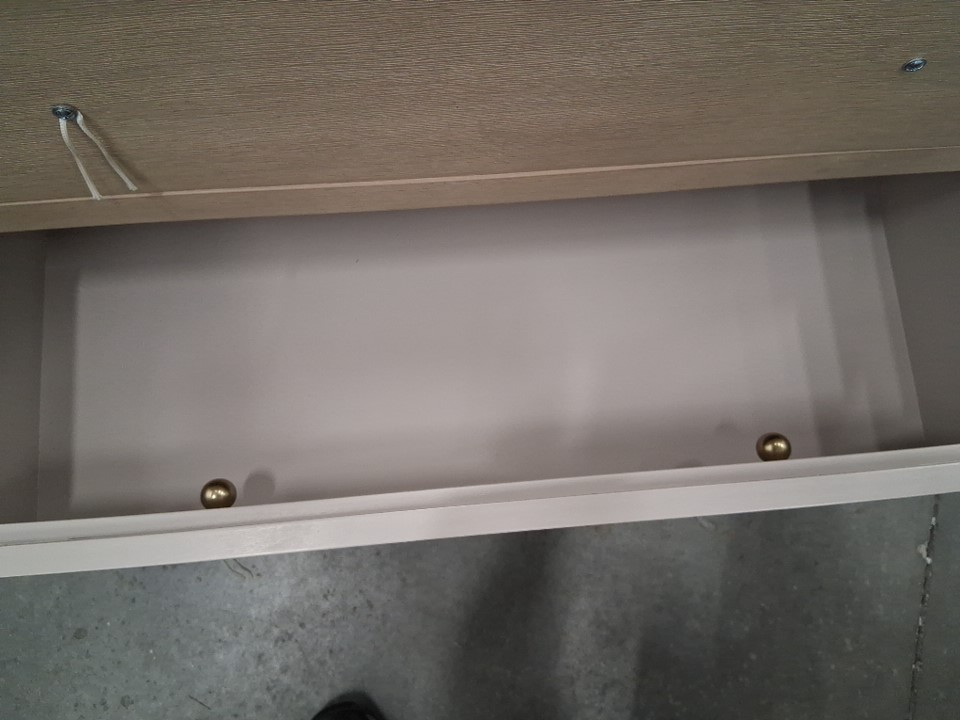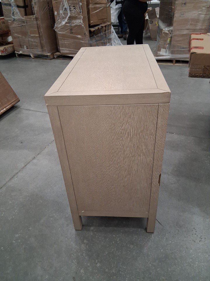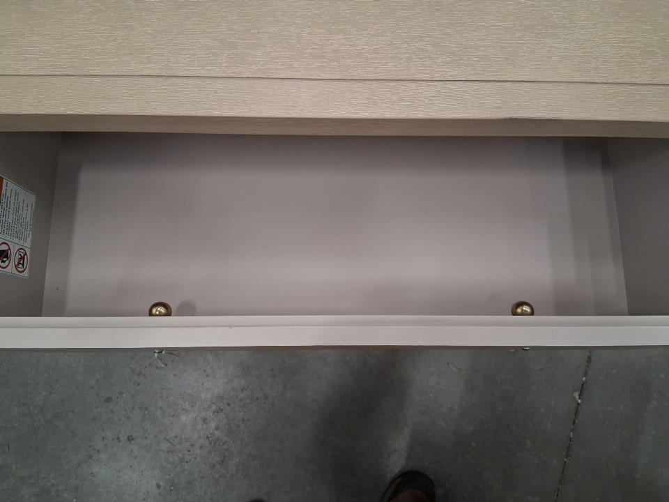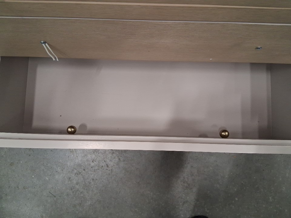 There are numerous scuffs on the top of the dresser, a small chip on the front left leg, and some chipping on the top right of the back side. One of the legs is also missing the bottom cap - see photos. Aside from this damage, appears unused. Some additional hardware (screws) may also be required in order to fully affix the dresser to a wall.