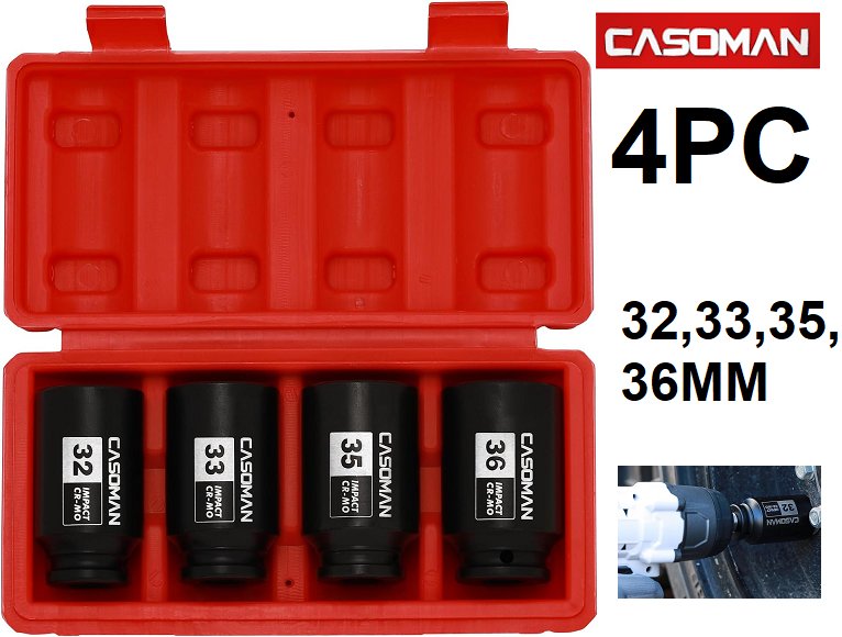4pc CASOMAN 1/2" Drive Deep Spindle Axle Nut Impact Socket Set, 6 Point - 32,33,35,36mm (model:cs051)