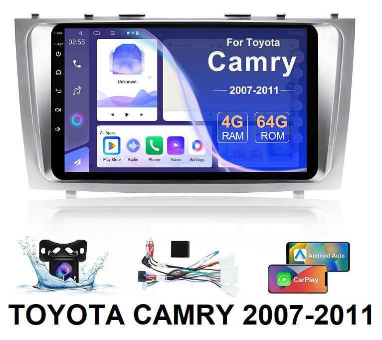 amerobo 4+64g 9" qled 1280x720 touch screen car stereo for toyota camry 2007-2011 with j-b-l harness, carplay, android auto, bluetooth, gps, wifi, & backup camera (model: 9001)