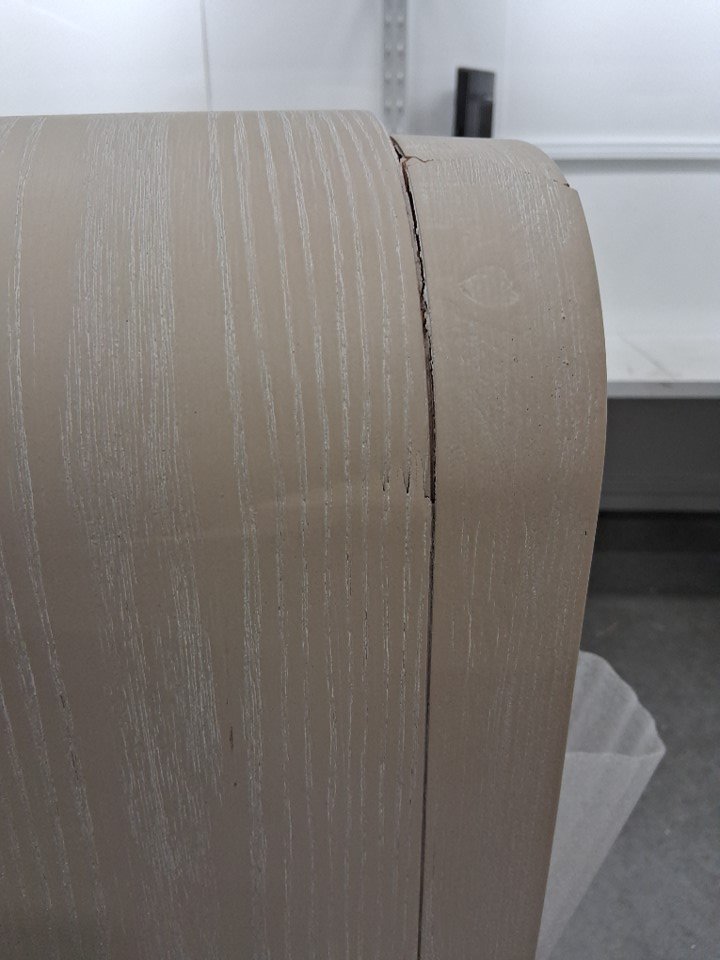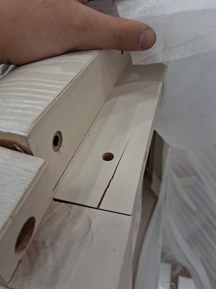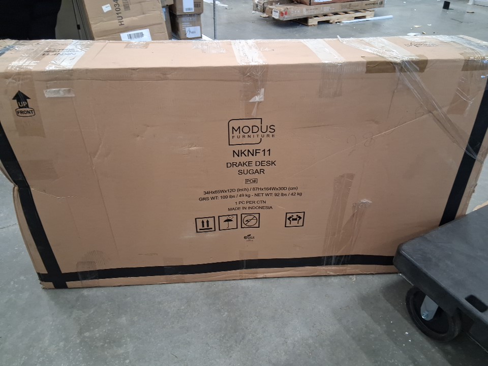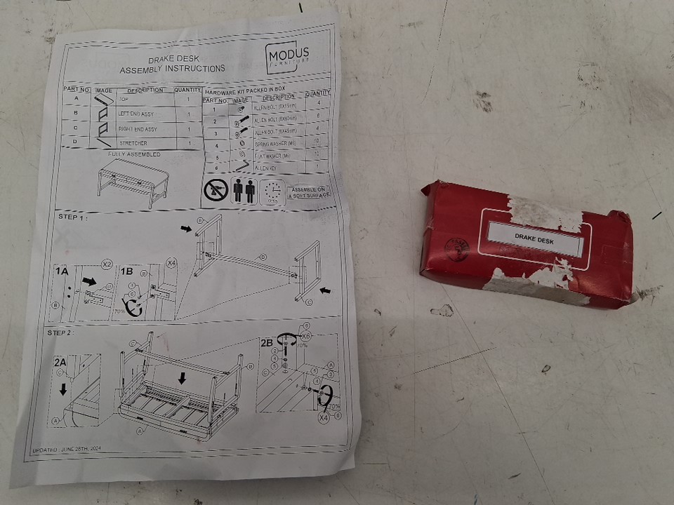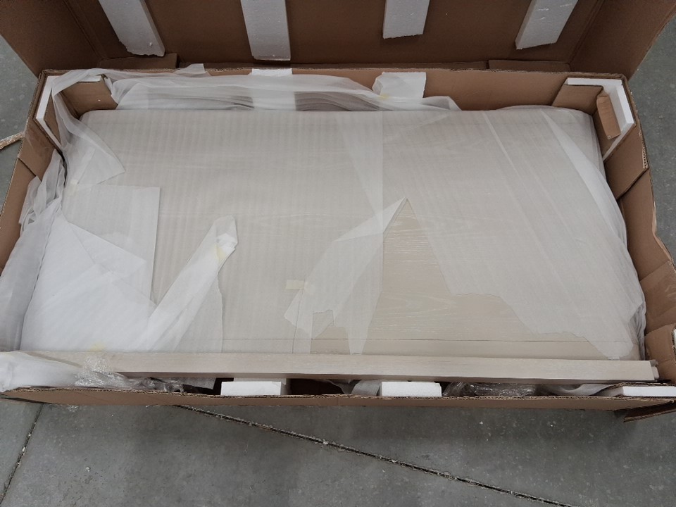 The front right side of the desktop has a sizeable crack in it, though this should not impede assembly repairing it is recommended in order to avoid potential further stress or breakage in the area - see photos. Outside of this damage, appears unused.