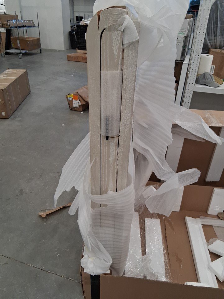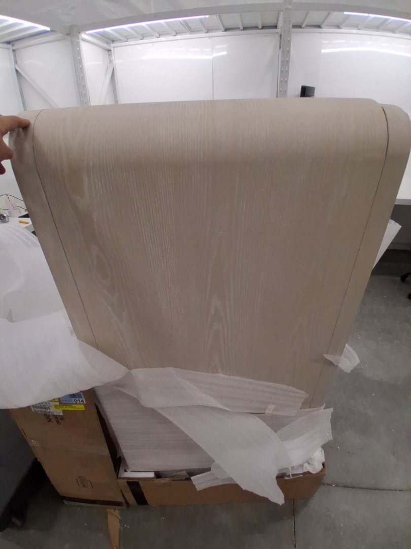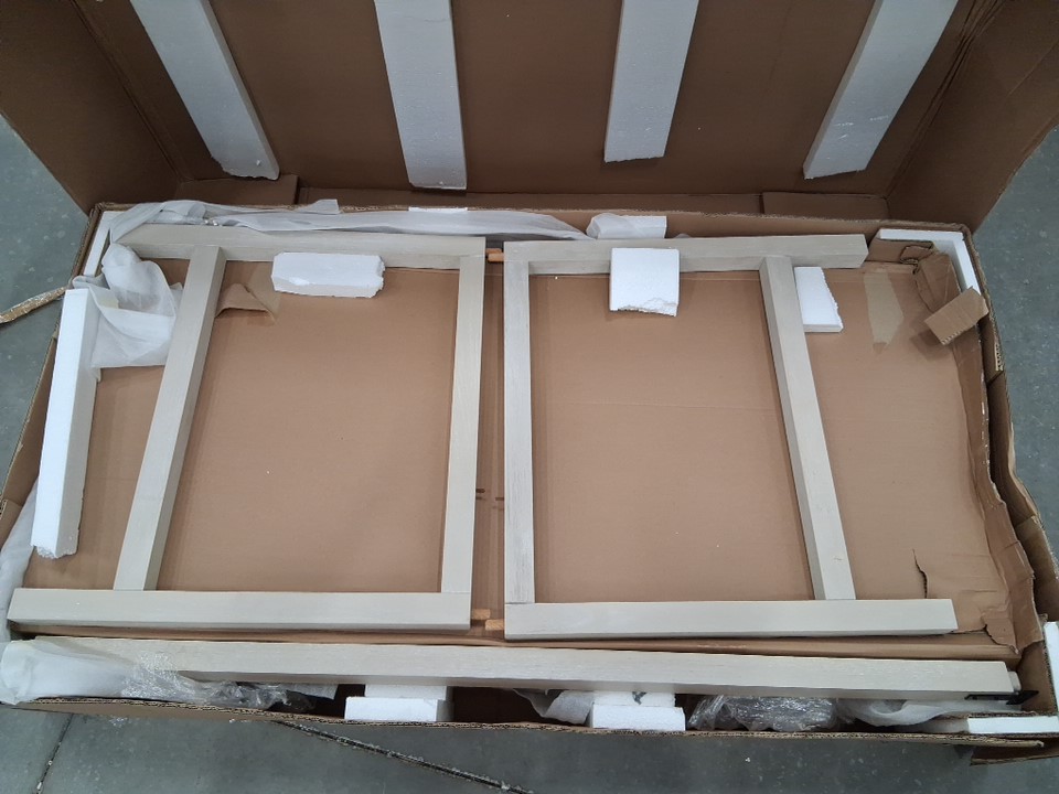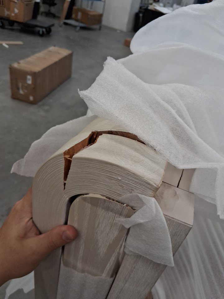 The front right side of the desktop has a sizeable crack in it, though this should not impede assembly repairing it is recommended in order to avoid potential further stress or breakage in the area - see photos. Outside of this damage, appears unused.