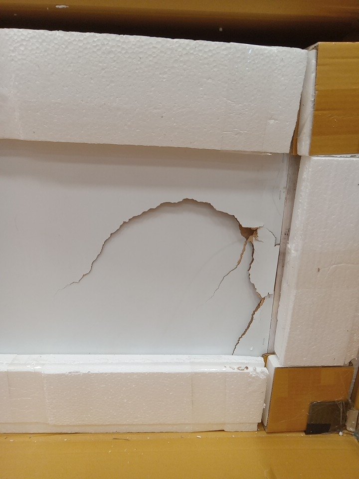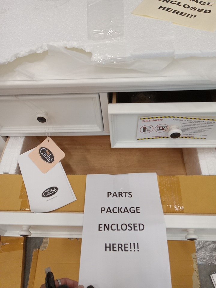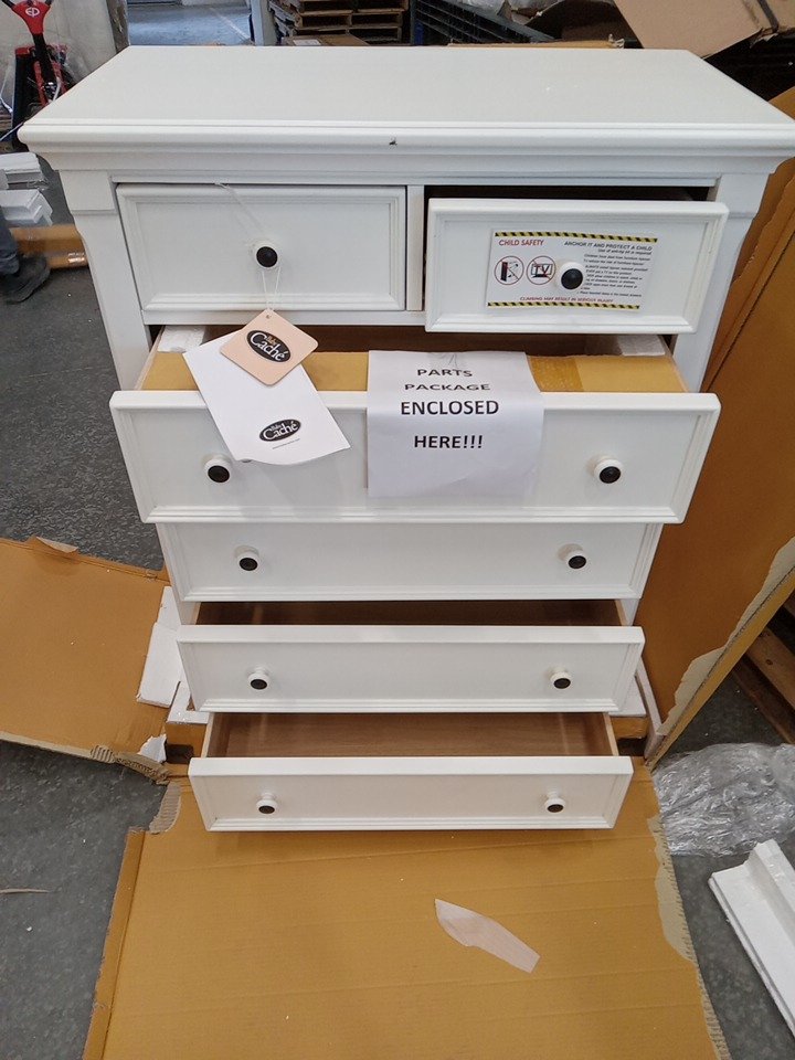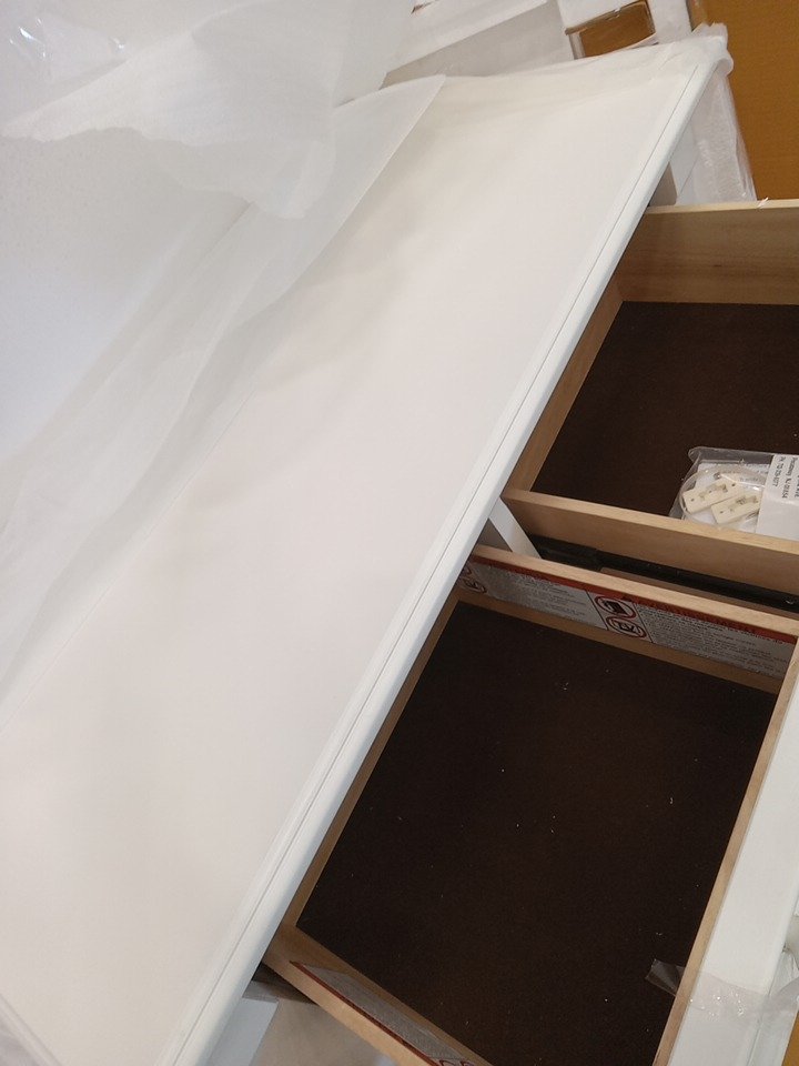 The item's base panel has been damaged during shipping, but not to the point of affecting the drawers. Please see the photos.