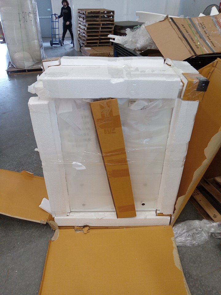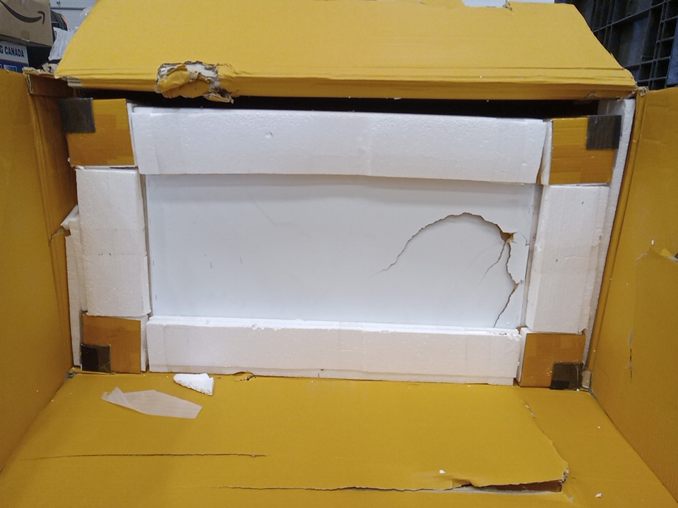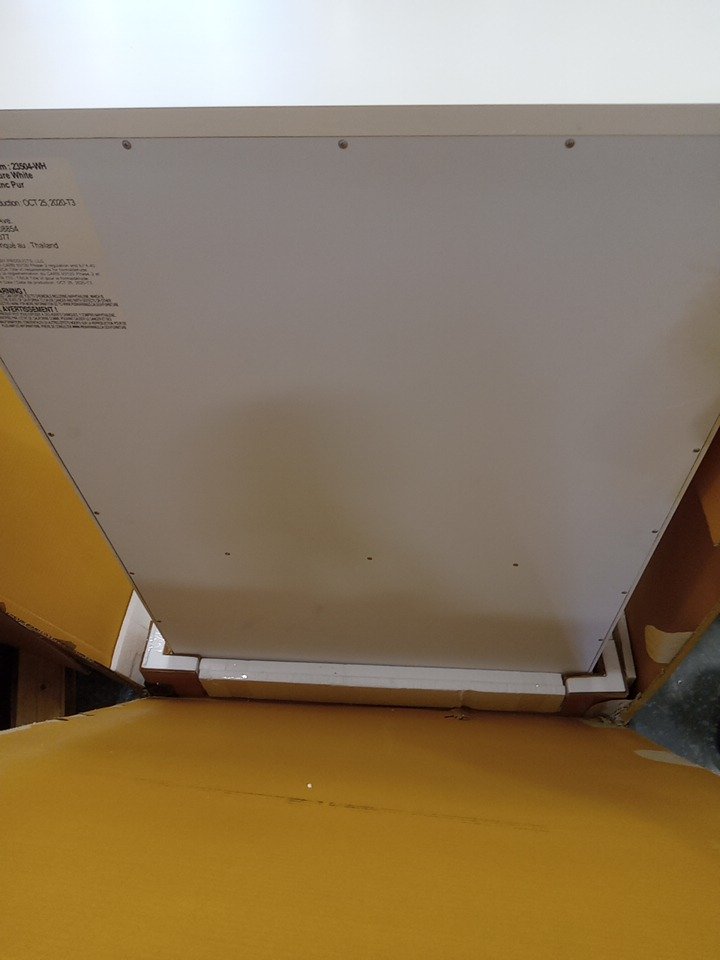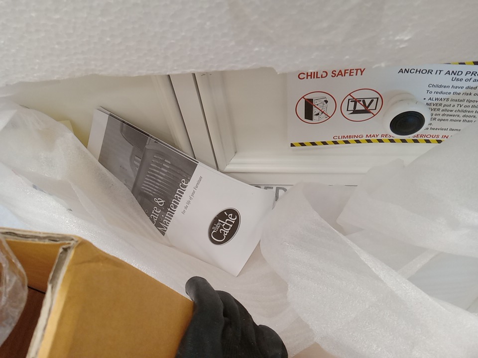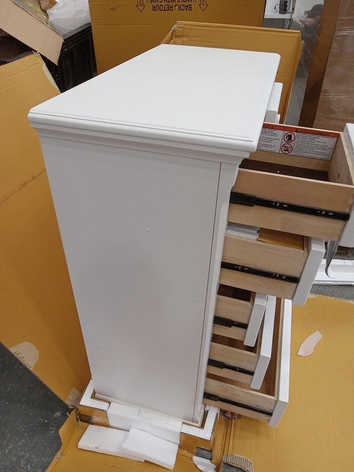 The item's base panel has been damaged during shipping, but not to the point of affecting the drawers. Please see the photos.