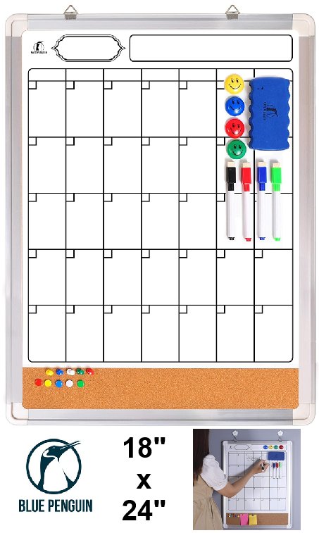 Blue Penguin White erase calendar with eraser, magnets, pins and markers - 18" x 24" WHITE