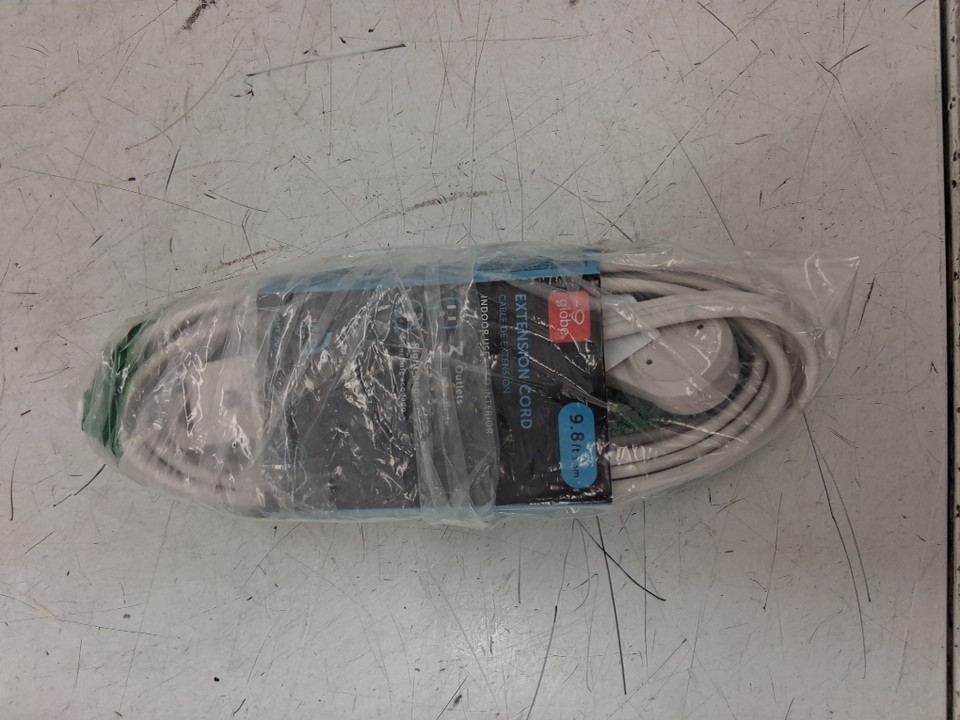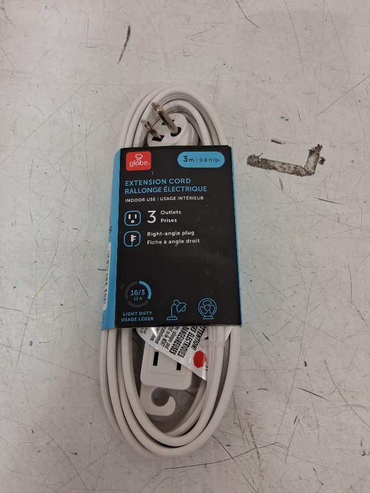 GLOBE ELECTRIC 3-OUTLET INDOOR EXTENSION CORD WITH RIGHT-ANGLE PLUG - GROUNDED - 9.8FT - WHITE