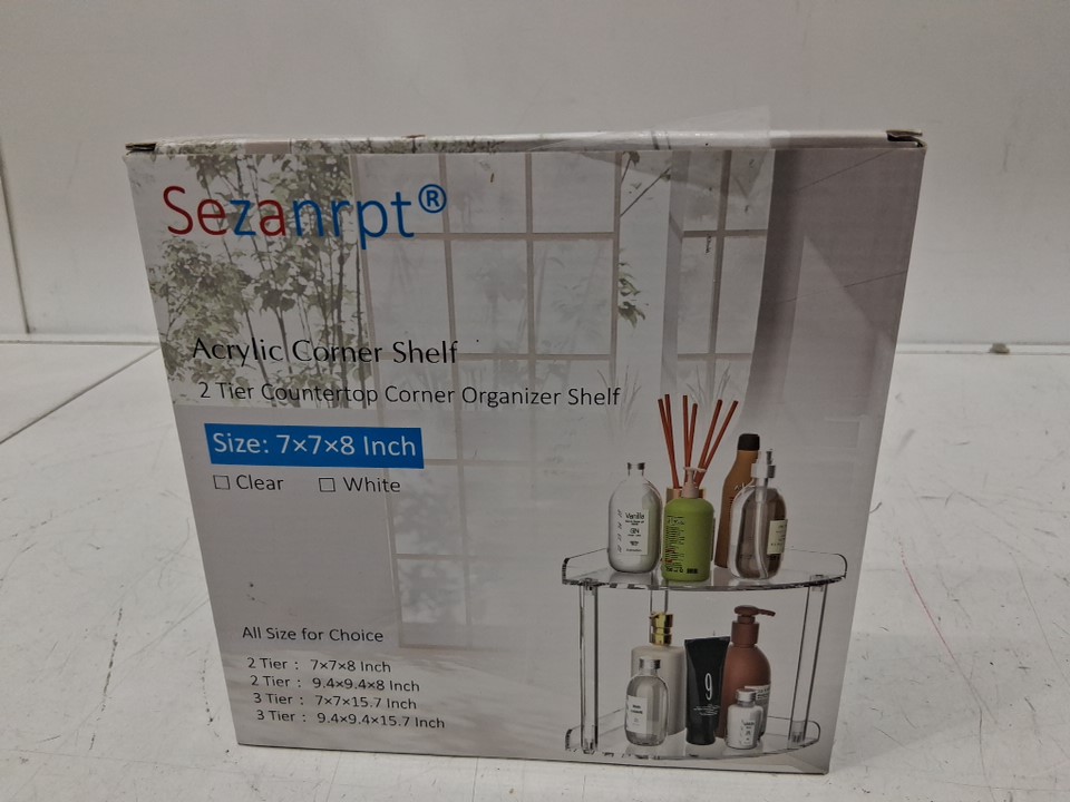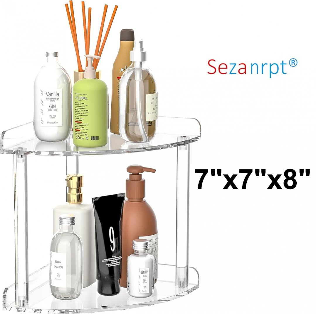 Sezanrpt 2 Tier Countertop Corner Organizer Shelf for Skincare and Cosmetics - 7"x7"x8" - CLEAR (MODEL: ‎BR-100310)