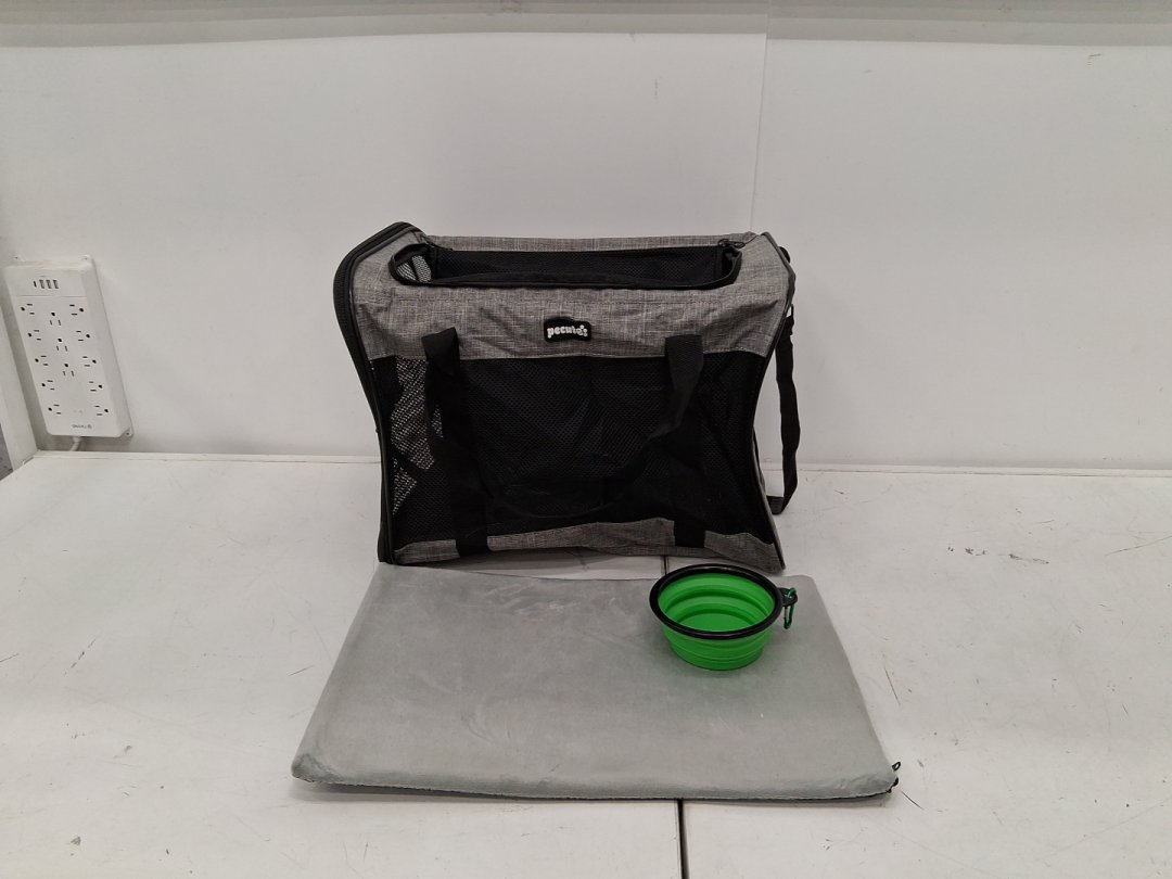 PECUTE Breathable Mesh Fabric Pet Carrier Bag with adjustable straps and feeding bowl - 16.5" x 11" - Grey/Black